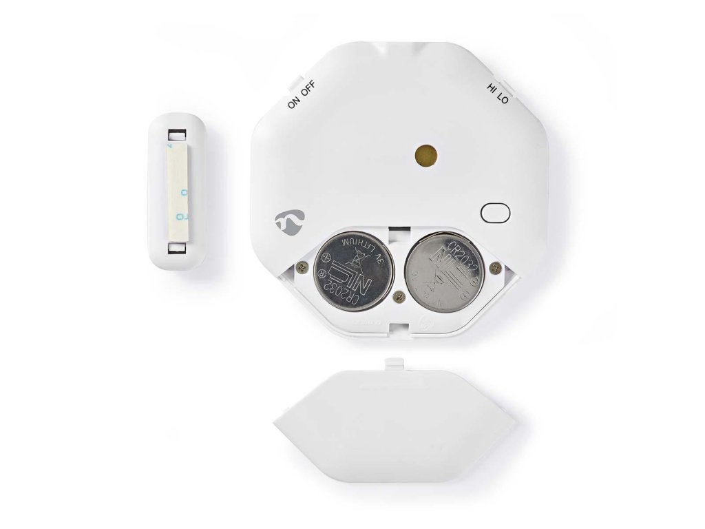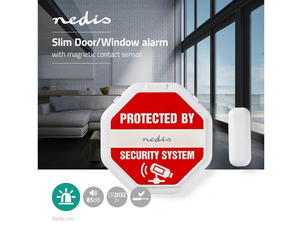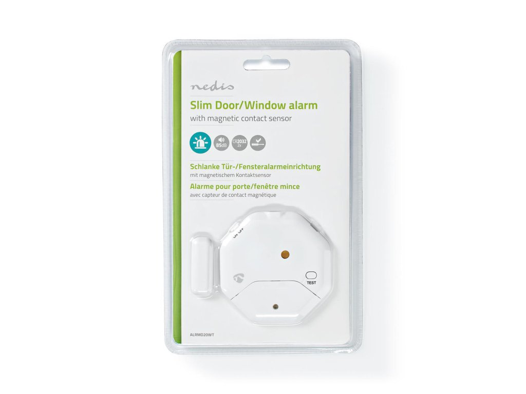Ultratenký okenní /dveřní alarm Nedis® slouží ke spuštění poplašného alarmu, pokud dojde k otevření dveří nebo okna. Díky jednoduchému postrannímu vypínači lze zařízení podle potřeby zapnout či vypnout. Tenký profil jej předurčuje ideálně k montáži na okno či dveře. Alarm je napájen 2 x CR2032 bateriemi (součástí balení), přičemž průměrná životnost baterie je za běžného používání jeden rok. Alarm je vybaven světelnou indikací téměř prázdné baterie. Stav baterie zkontrolujete stisknutím tlačítka „Test“ na čelní straně zařízení. Jednotku alarmu připevněte pomocí oboustranné lepicí pásky (součástí balení). Alarm a magnetický snímač stačí přilepit na dveře či okno a jste hotovi.