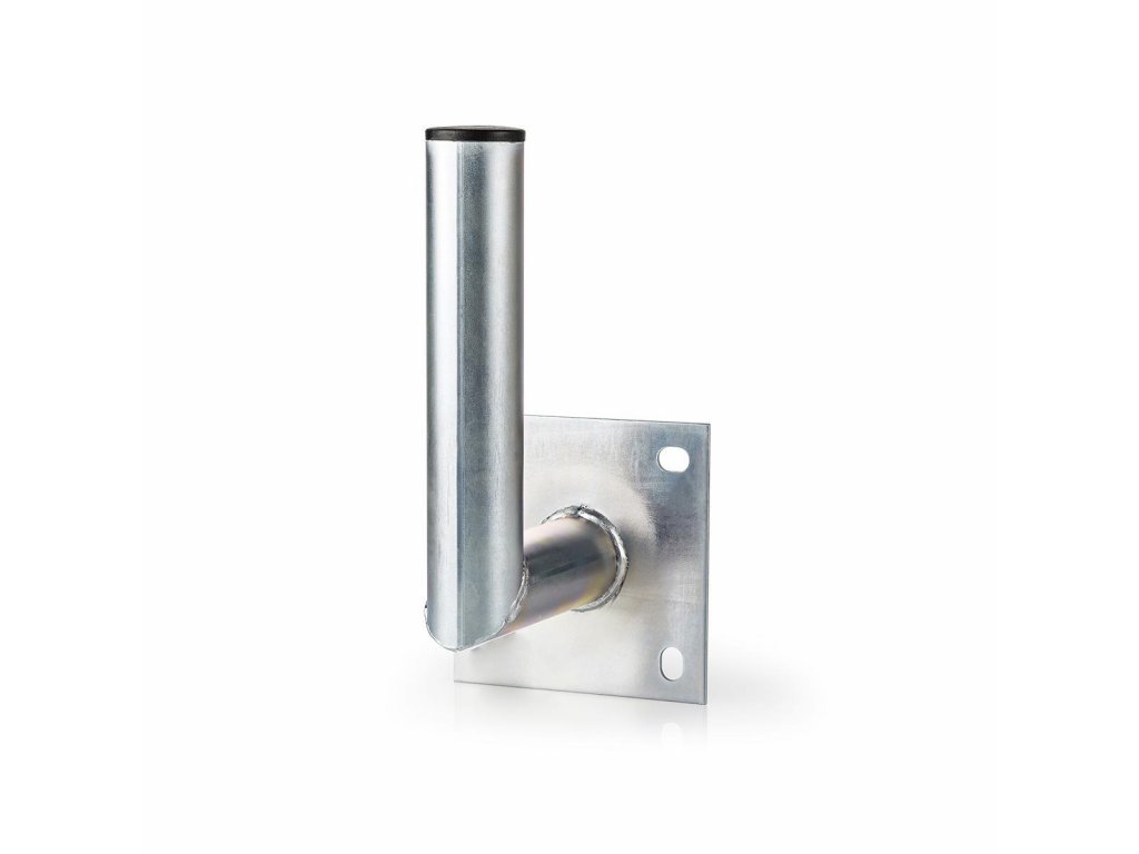 Nástěnný držák ve tvaru L z pozinkované oceli se zaslepovacím víčkem určený k důkladnému upevnění parabolické nebo běžné antény na fasádu, zeď nebo komín. Čtvercová plotna se čtyřmi montážními otvory zajistí, že nástěnný držák zůstane i při velkém zatížení bezpečně připevněný k povrchu.