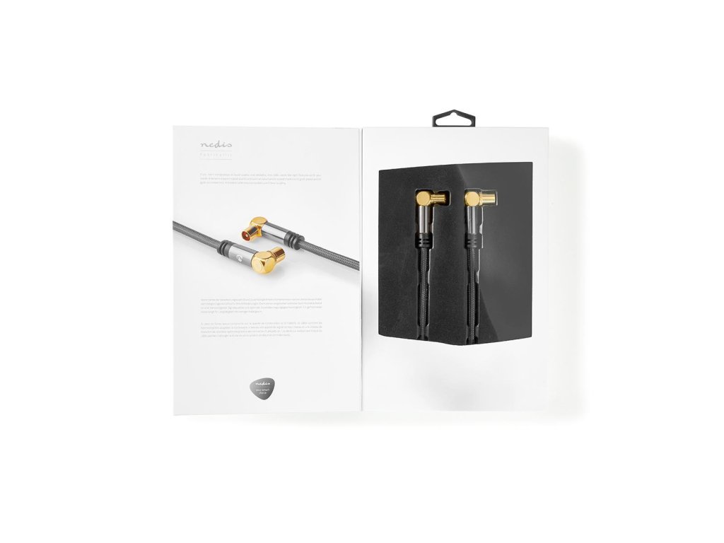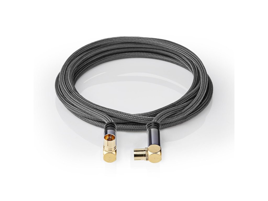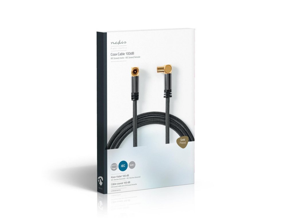 Nedis® Fabritallic značkový koaxiální anténní propojovací kabel nejvyšší kvality s konektory zástrčka Coax (IEC) na zásuvka Coax (IEC). Kabel má špičkové konektory ze slitiny hliníku pozlacené 24karátovým zlatem pro vynikající kvalitu obrazu, nylonové opletení kabelu zajišťuje dlouhodobou spolehlivost a ochranu proti ultrafialovému záření, vodič z bezkyslíkaté mědi pro vynikající přenos signálu s minimálními ztrátami a stínění třídy A++ zaručuje příjem signálu v maximální kvalitě. Prémiové balení v dárkovém boxu. Délka 5 m.