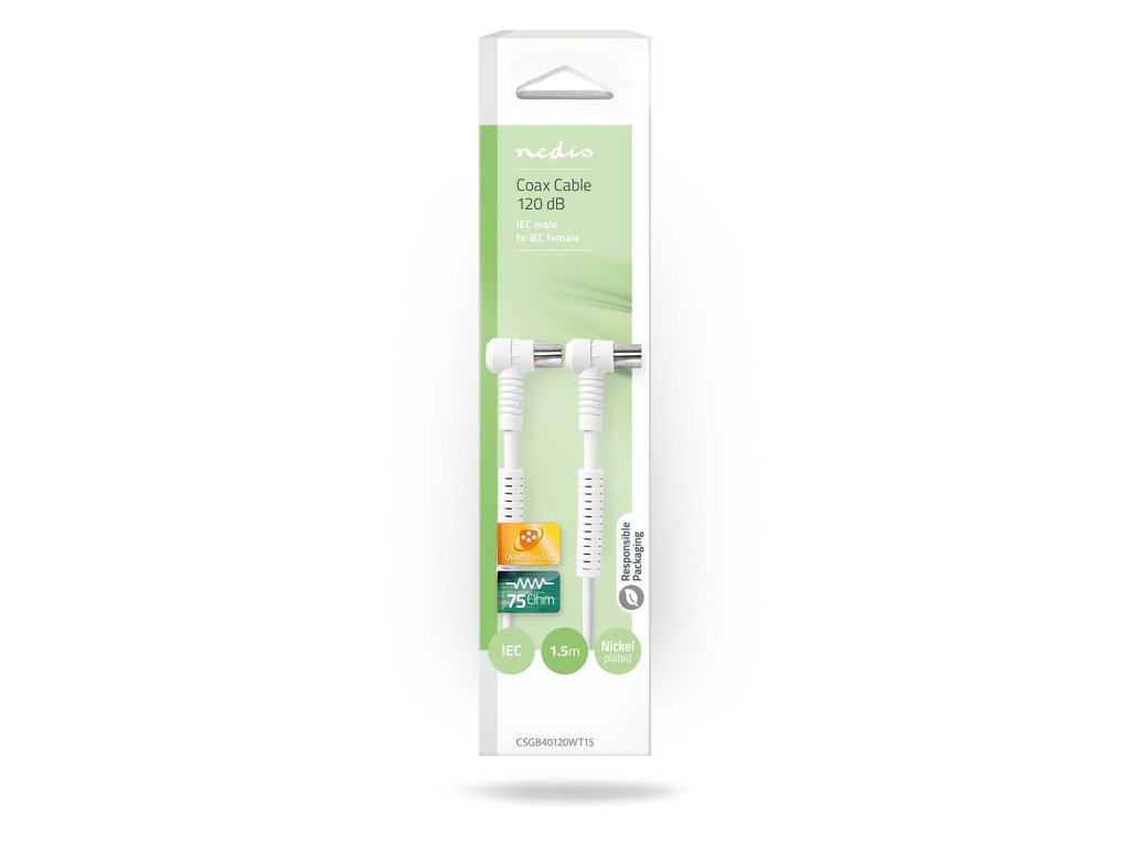 Kvalitní 120 dB koaxiální kabel Nedis® je vhodný pro zapojení televizoru nebo set-top boxu do anténní koaxiální zásuvky ve zdi. Kabel se čtyřnásobným stíněním, feritovými interferenčními filtry a měděnými vodiči je vhodný především pro nejmodernější smart TV. Osazen konektory úhlová zástrčka IEC Coax - úhlová zásuvka IEC Coax. Délka 1.5 m.