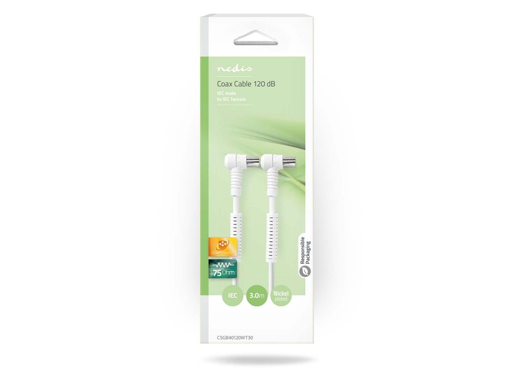 Kvalitní 120 dB koaxiální kabel Nedis® je vhodný pro zapojení televizoru nebo set-top boxu do anténní koaxiální zásuvky ve zdi. Kabel se čtyřnásobným stíněním, feritovými interferenčními filtry a měděnými vodiči je vhodný především pro nejmodernější smart TV. Osazen konektory úhlová zástrčka IEC Coax - úhlová zásuvka IEC Coax. Délka 3 m.