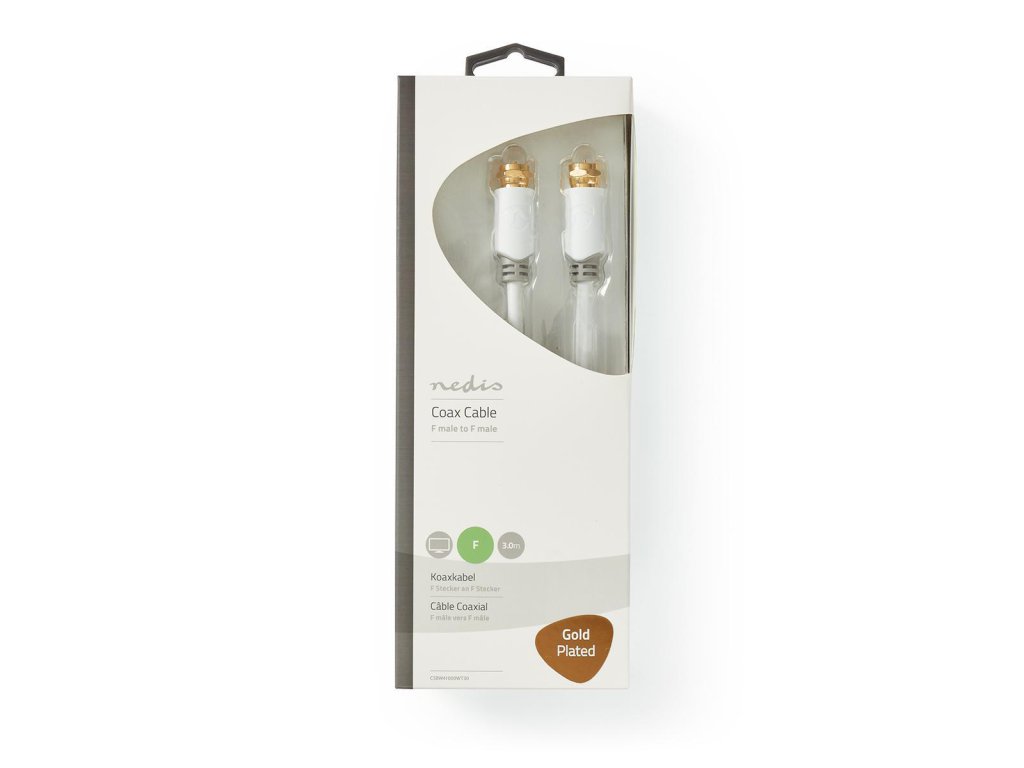 Značkový Nedis® propojovací anténní kabel s F konektory je vhodný např. k připojení satelitní nebo DVB-T2 antény, přijímači nebo televizoru. Délka 3 m, bílá barva.