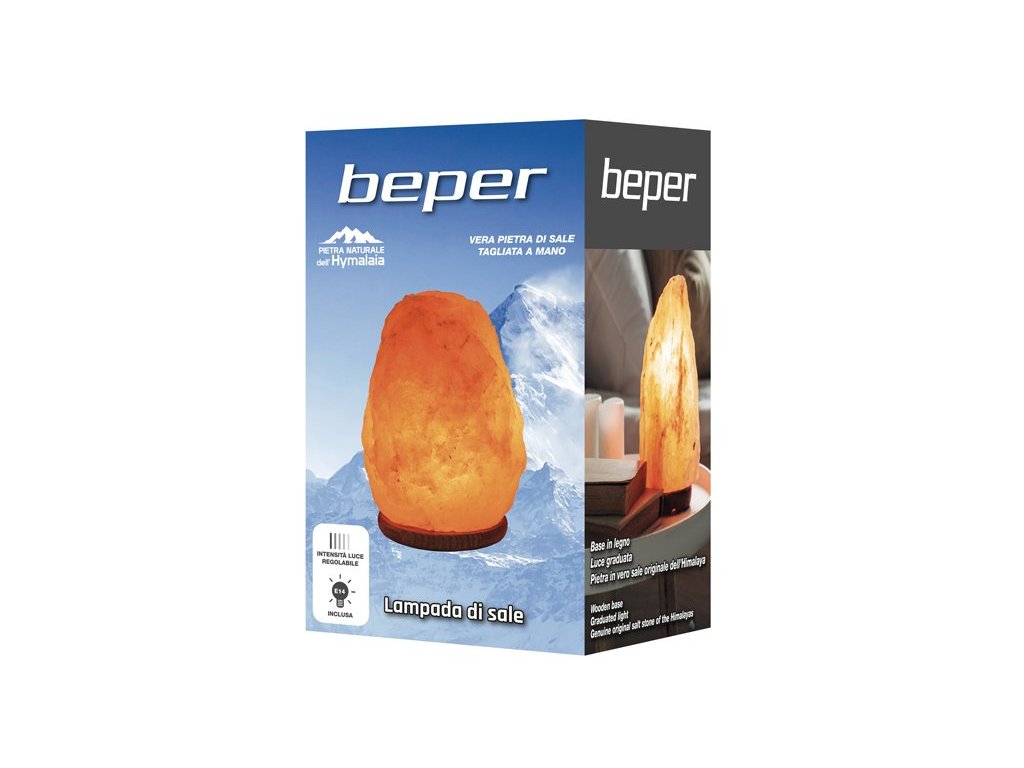 BEPER P201UTP100 solná lampa je elektrická lampa z přírodního solného kamene, který se těží v Himálaji. Lampa Je osvětlena zevnitř žárovkou a tato kombinace vydává příjemně tlumené, jantarové světlo. Ruční zpracování a broušený minerál dává každému kusu jedinečné tvary a odstíny.