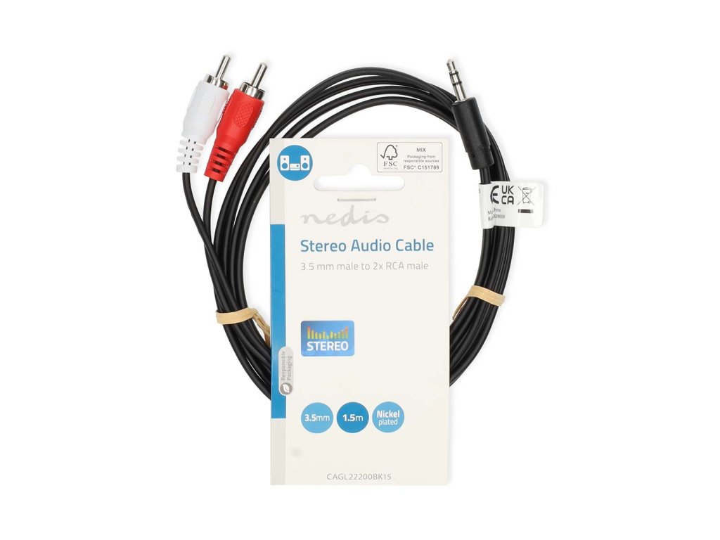 Nedis® propojovací stereo audio kabel s konektory Jack 3.5 mm zástrčka na 2 x cinch (RCA) zástrčka. Vhodný např. pro připojení přehrávače nebo mobilního telefonu k reproduktorům, zesilovači atd. Délka 1.5 m.