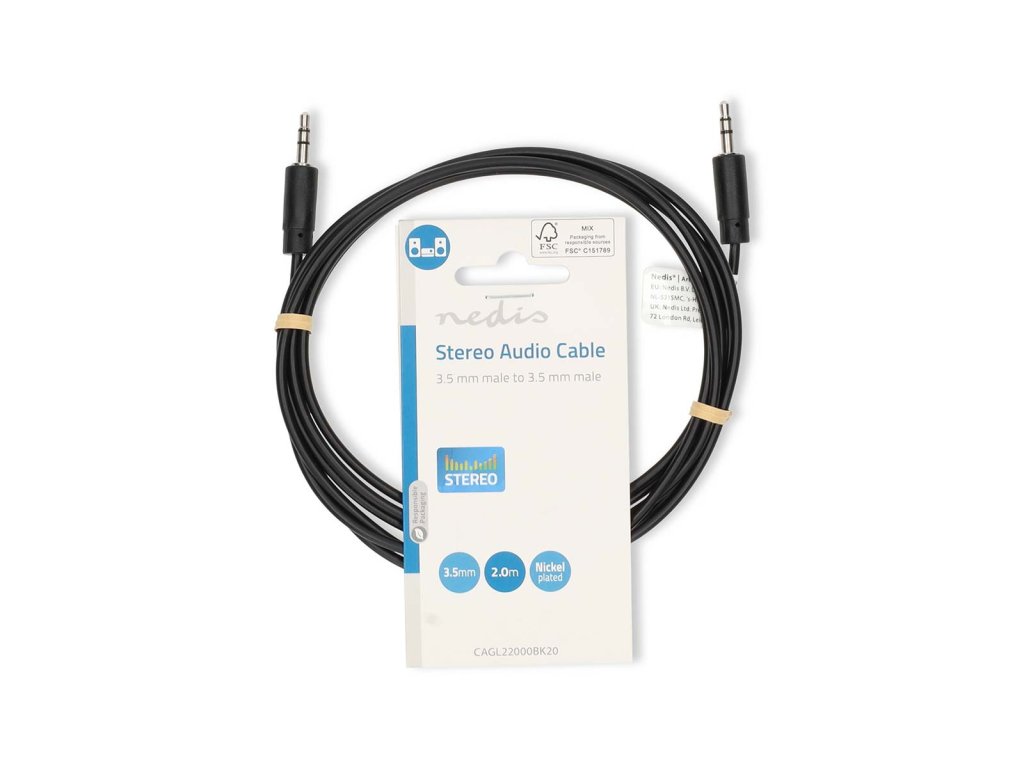 Nedis® propojovací audio kabel s konektory jack 3.5 mm zástrčka na jack 3.5 mm zástrčka. Vhodný např. pro připojení přehrávače ke reproduktorům, počítači, zesilovači atd. Délka 2 m.