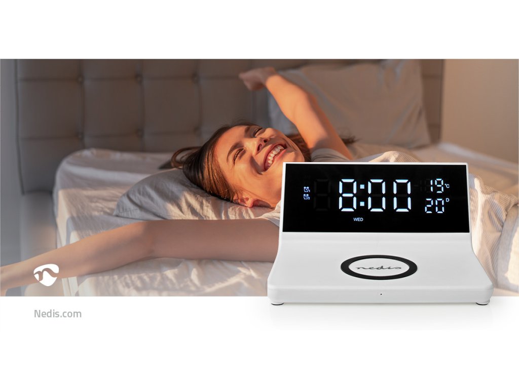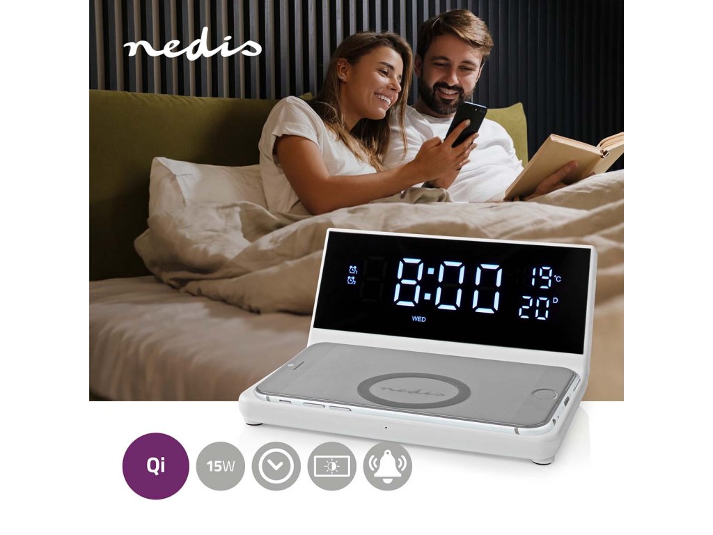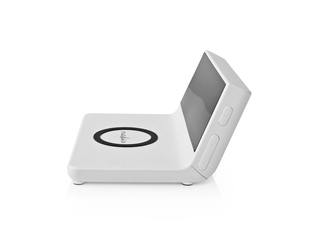 Nedis WCACQ20WT bezdrátová nabíječka mobilu, Qi certifikace, budík, bílá