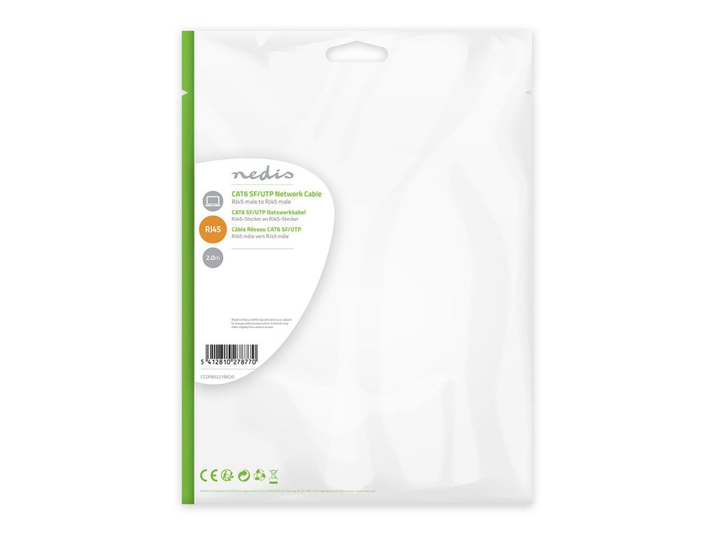 Značkový Nedis® síťový kabel SF/UTP CAT6 s dvojitým stíněním, zástrčka RJ45 - úhlová zástrčka RJ45 pro síť Ethernet s rychlostí 10/100/1000 Mb/s. Plášť LSZH (Low Smoke Zero Halogen, bez halogenů s nízkou tvorbou kouře). Délka 2 m.