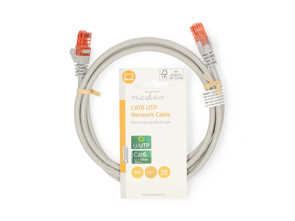 Nestíněný Nedis® síťový patch kabel U/UTP CAT6, zástrčka RJ45 - zástrčka RJ45 pro síť Ethernet s rychlostí 10, 100 a 1000Mb/s. Délka 1.5m.