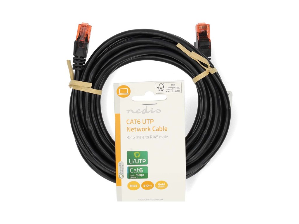 Nestíněný Nedis® síťový patch kabel U/UTP CAT6, zástrčka RJ45 - zástrčka RJ45 pro síť Ethernet s rychlostí 10, 100 a 1000Mb/s. Délka 5 m.
