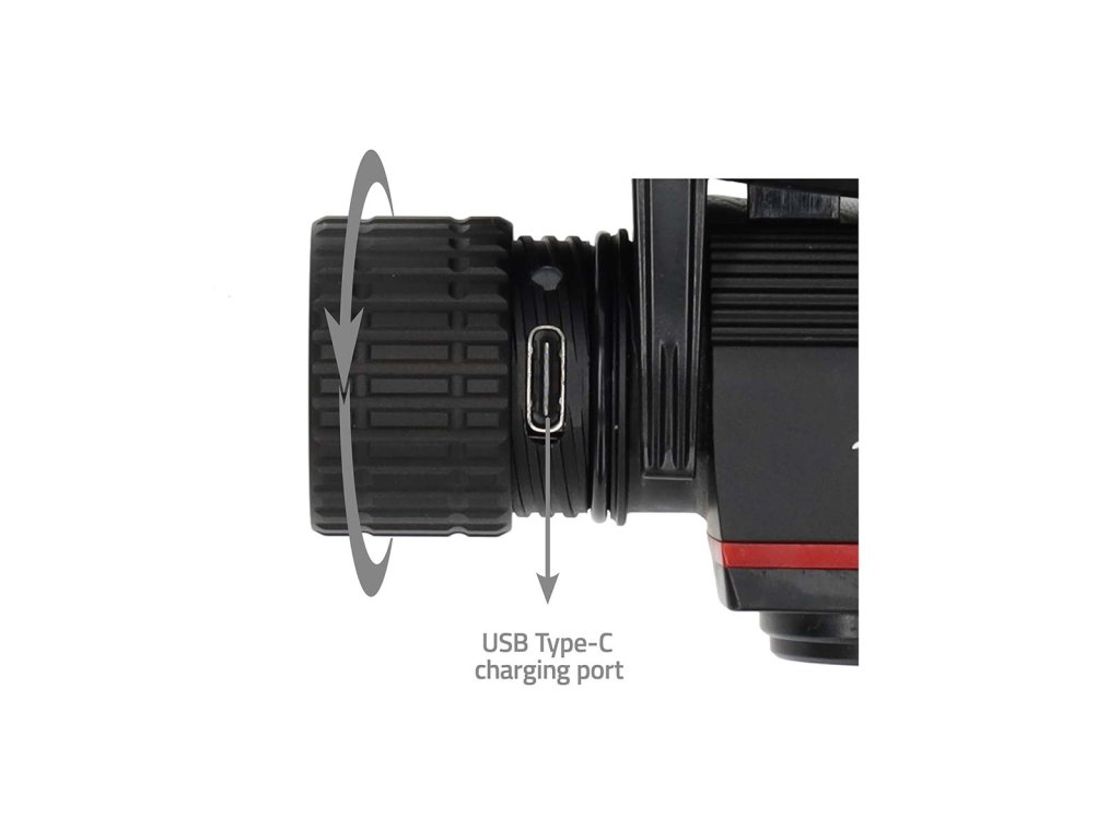 Svítilna je vybavena skrytým nabíjecím portem USB typu C, který usnadňuje nabíjení na cestách. S tlačítkem pro různé režimy si můžete vybrat mezi svitem 100 % (450 lm) nebo 30 % (120 lm), reflektorem 600 lm nebo obojím + dálkovým světlem 1000 lm. Svítilna se také může pochlubit působivou vzdáleností paprsku až 180 metrů s až 1000 lumeny.