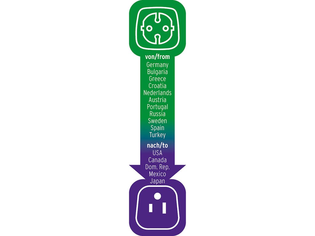 Kvalitní cestovní adaptér Německého výrobce Brennenstuhl umožňující použití nezemněných elektrických spotřebičů používajících zástrčku CZ, DE, NL, ES, PT, SE, FI, NO, GR, TR, AT ... v USA, Kanadě, Dominikánské Republice, Mexiku, Japonsku.