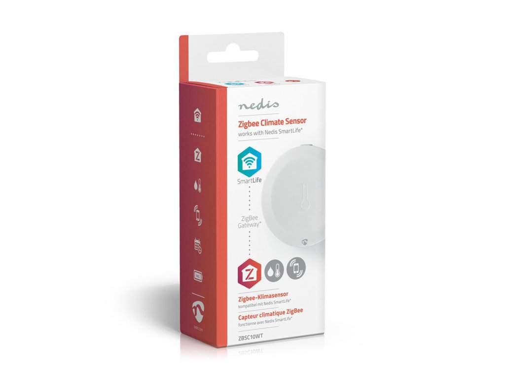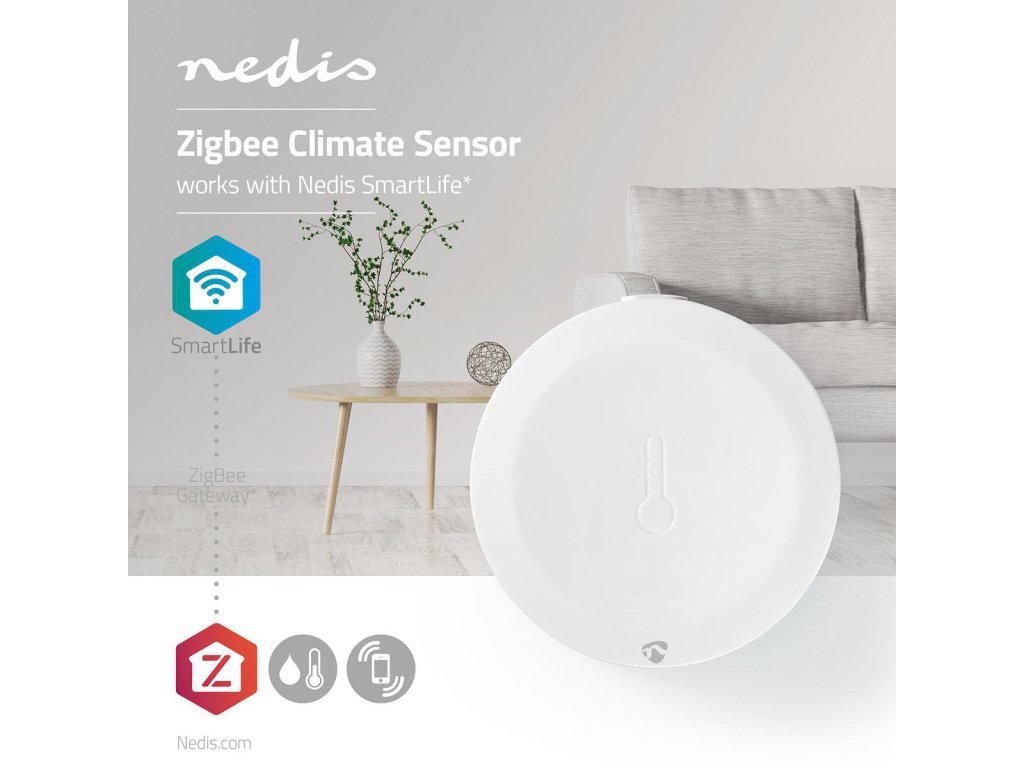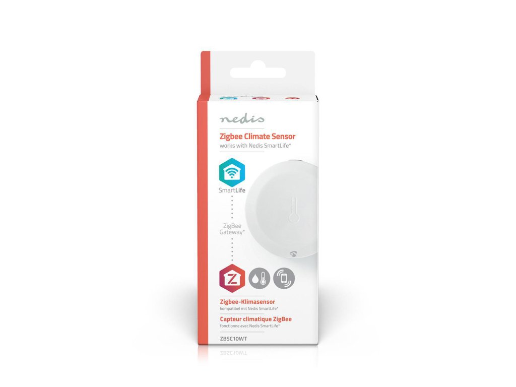 Tento chytrý snímač klimatických podmínek měří teplotu v místnosti (0-40 °C) i vlhkost vzduchu (0-95 %) a odesílá tyto informace do aplikace Nedis SmartLife. K tomu je nutná brána Nedis Zigbee (WIFIZBxxx).
