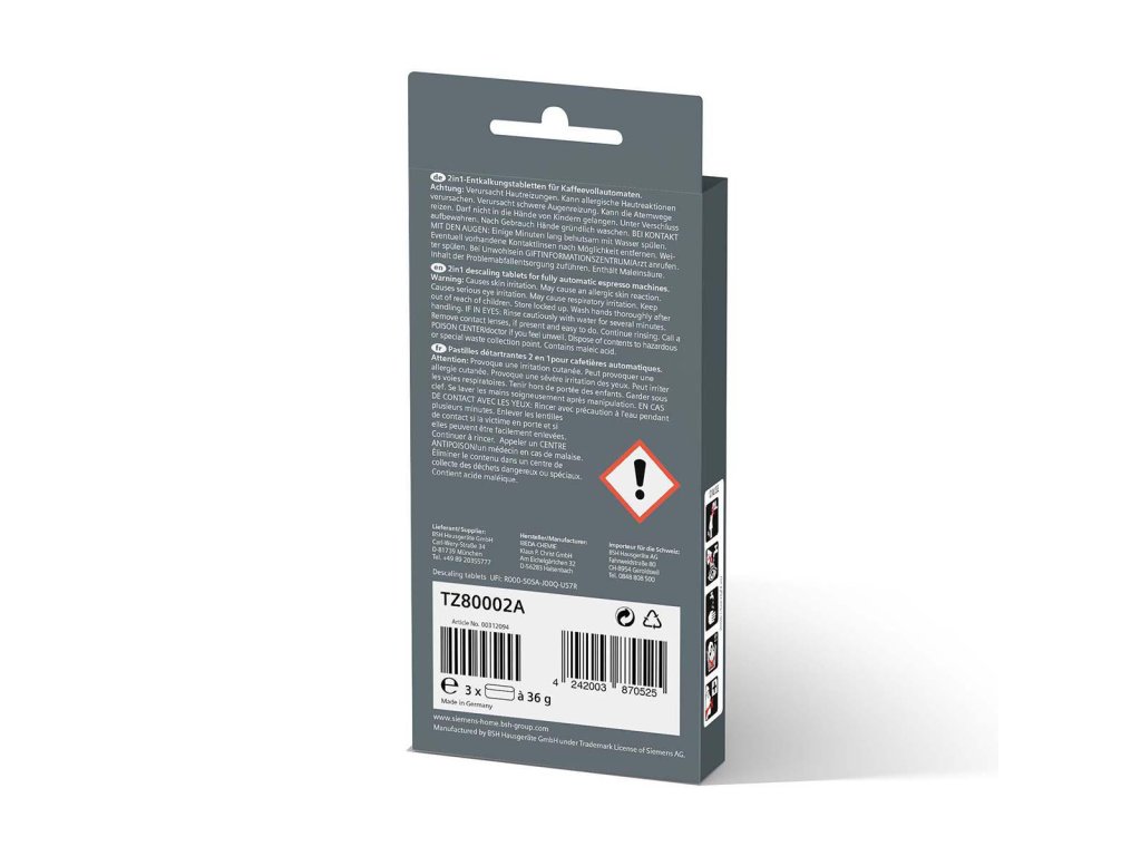 Originální odvápňovací tablety Siemens řady EQ pro všechny plně automatické kávovary řady EQ, Surpresso, stejně jako vestavěné plně automatické kávovary Siemens 2v1 s optimalizovaným programem automatického čištění. Důkladně a spolehlivě vyčistí kávovar od usazenin vodního kamene. 2v1 - odstraňují vodní kámen a chrání před korozí. Pro lepší aroma kávy a delší životnost přístroje.