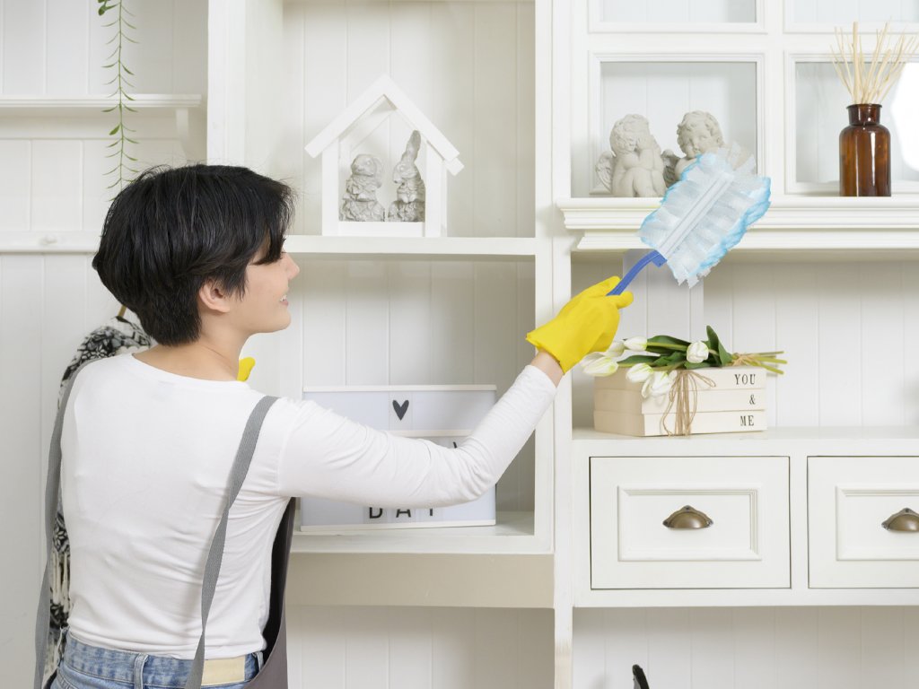 Rozložte rukojeť a zatlačte na ni, dokud nezapadne do svého vodítka. Vložte rukojeť do hlavice prachovky. Ujistěte se, že jste prachovku zasunuli až na doraz. Zatřeste násadou, aby se prachovka roztáhla a vytvarovala.