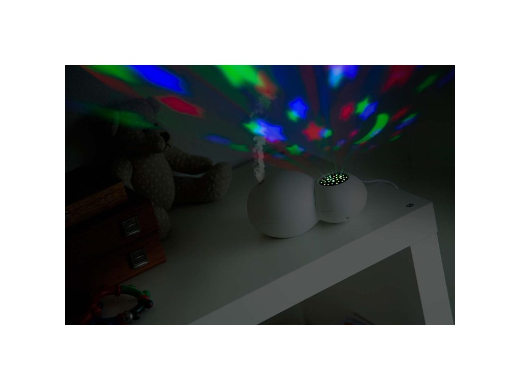 Miminka a malé děti hodně spí, a to nejen proto, aby si odpočinuly. Během spánku zpracovávají nespočet nových vjemů a rychle rostou. Spánek je proto důležitý a je příjemné, když vaše děťátko může v klidu snít. Tento zvlhčovač vzduchu s projektorem tomu napomáhá. Na strop nad postelí/kolébkou vašeho děťátka promítnete hvězdnou oblohu. V jemných barvách a pohybu bude usínat. Naplníte zásobník na vodu a poté zvlhčovač zajistí dobrou kvalitu vzduchu až na osm hodin. Můžete k němu také přidat příjemnou vůni, která se jemně rozprostře po celé místnosti. Zásobník na vodu je vhodný pro místnosti do 20 m2 a po vyprázdnění zásobníku se přístroj automaticky vypne.