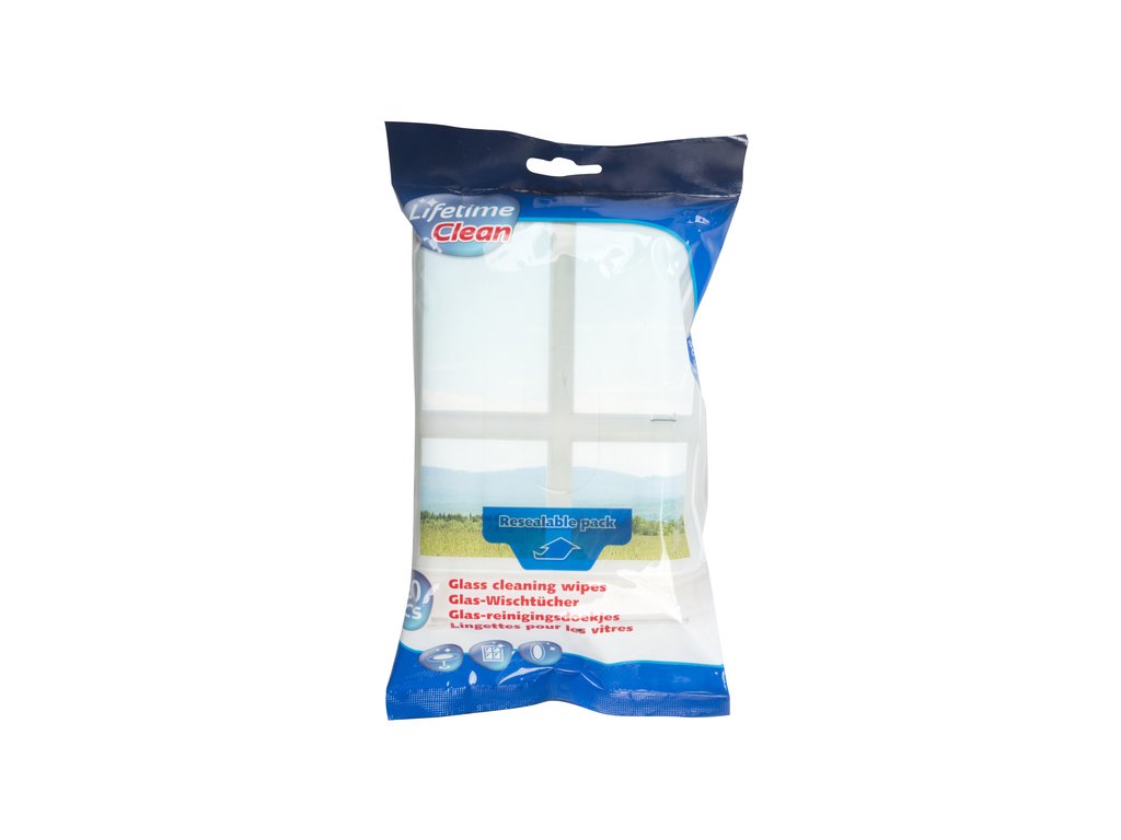 Vlhčené ubrousky Lifetime Clean k čištění oken, skel, zrcadel a skleněných povrchů.