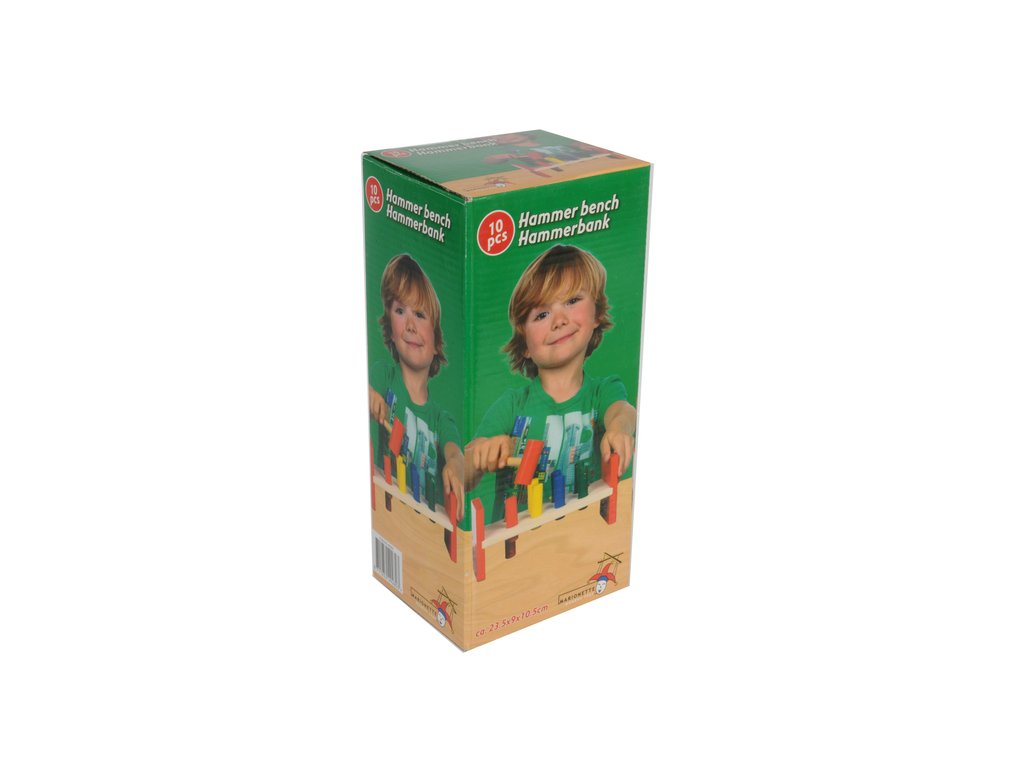Pomocí dřevěného kladívka děti zatloukají 8 špalíčků různých barev. Po zatlučení všech špalků se polička obrátí a dítě může začít znovu - cvičí si tak svou motoriku, manuální zručnost, přesnost, fantazii a obratnost.