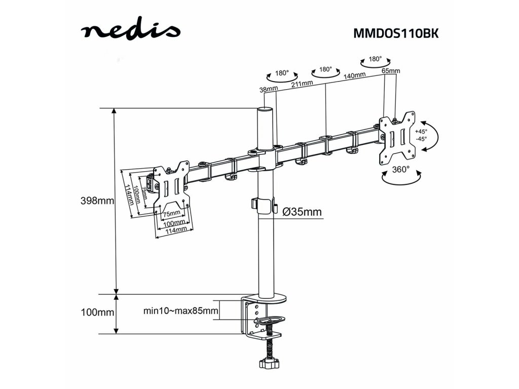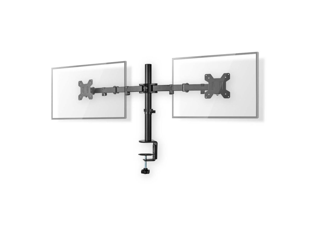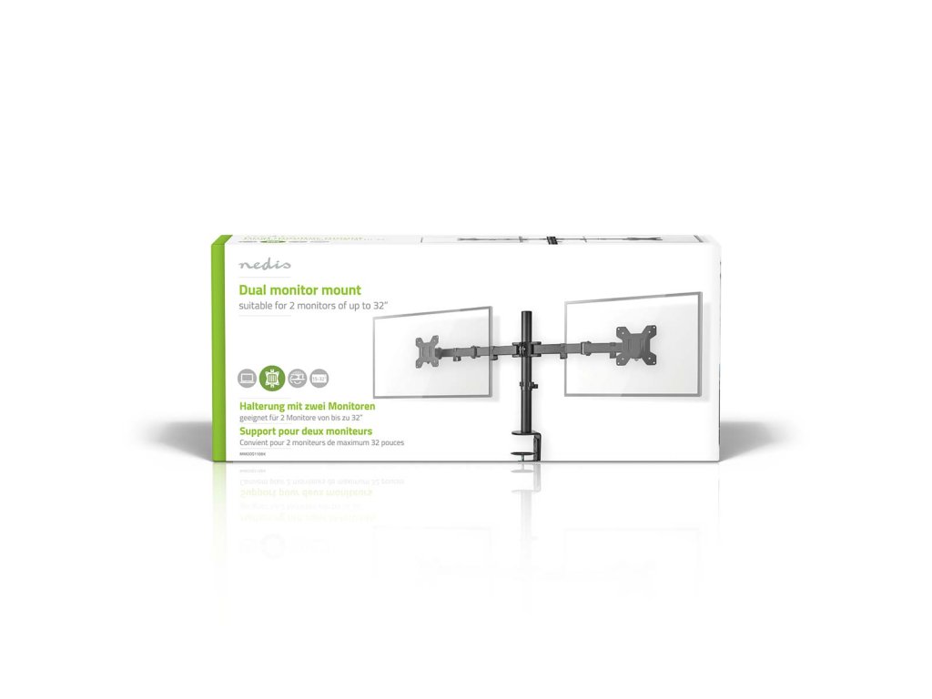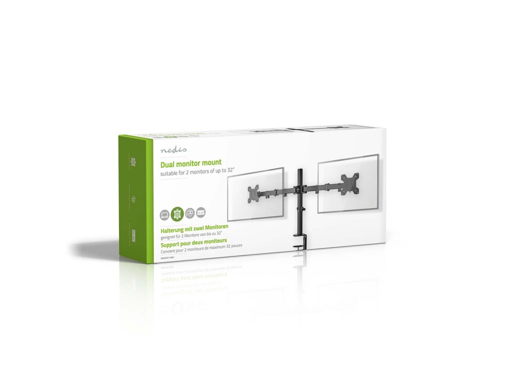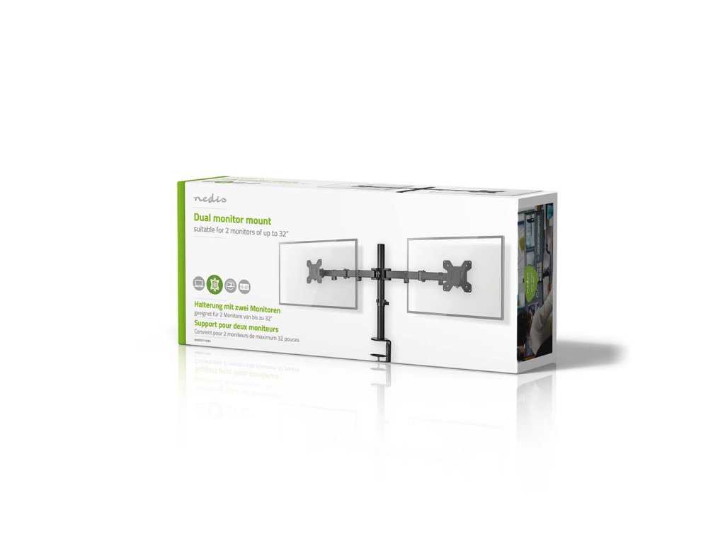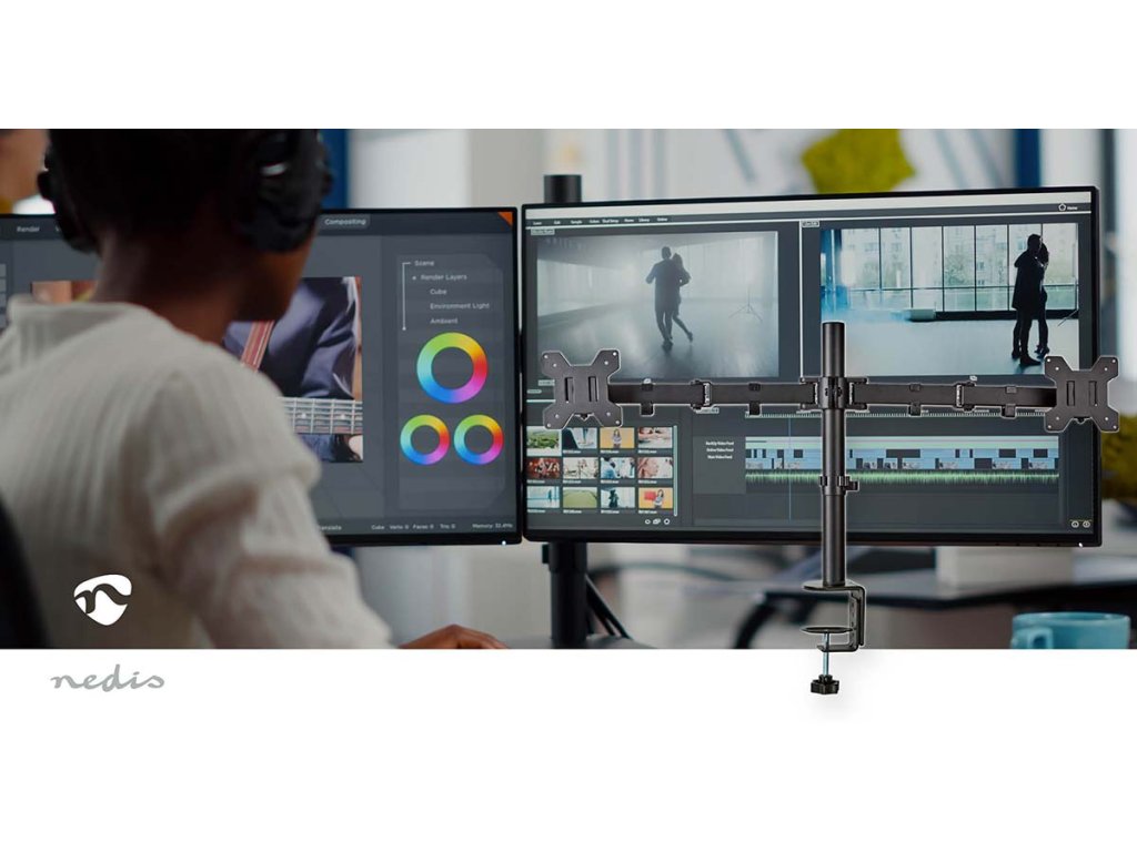 Držák Nedis je vhodný pro dva monitory s úhlopříčkou až 32". Všestranné možnosti naklápění (50°), otáčení (360°) a natočení (180°) umožňují nastavit držák do libovolného úhlu. Tento držák je skvělou volbou pro prostorově úsporné umístění na stolech pomocí stolní svorky pro snadnou a rychlou instalaci.