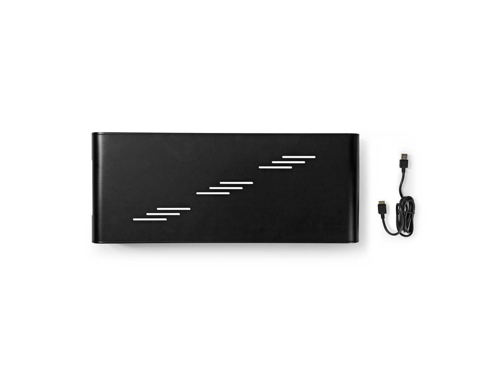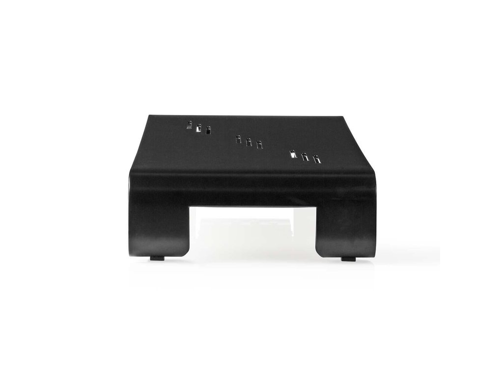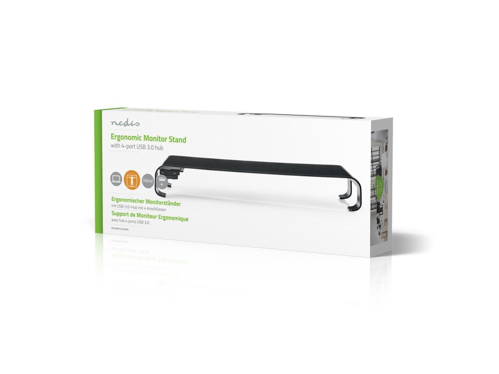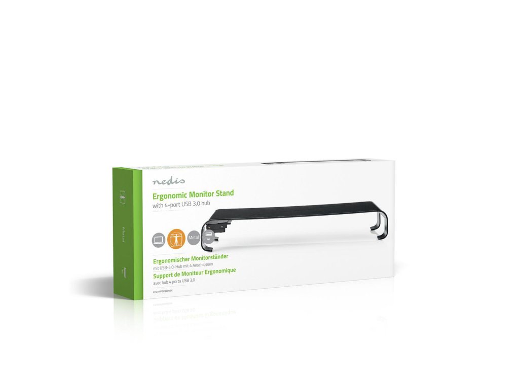 Nedis® ergonomický podstavec pod monitor zvedá obrazovku na úroveň očí, čímž zmírňuje svalové napětí ramen a šíje. Je vyrobený ze slitiny hliníku a plastu pro maximální pevnost a díky svému praktickému designu ušetří místo na vašem pracovním stole. Vestavěný rozbočovač USB 3.0 se 4 porty umožňuje snadné připojení zařízení, jako je tiskárna, skener, myš, klávesnice nebo externí pevný disk. Stojan je určen pro jeden monitor s maximální hmotností 18 kg a poskytuje prostor pro uložení klávesnice.