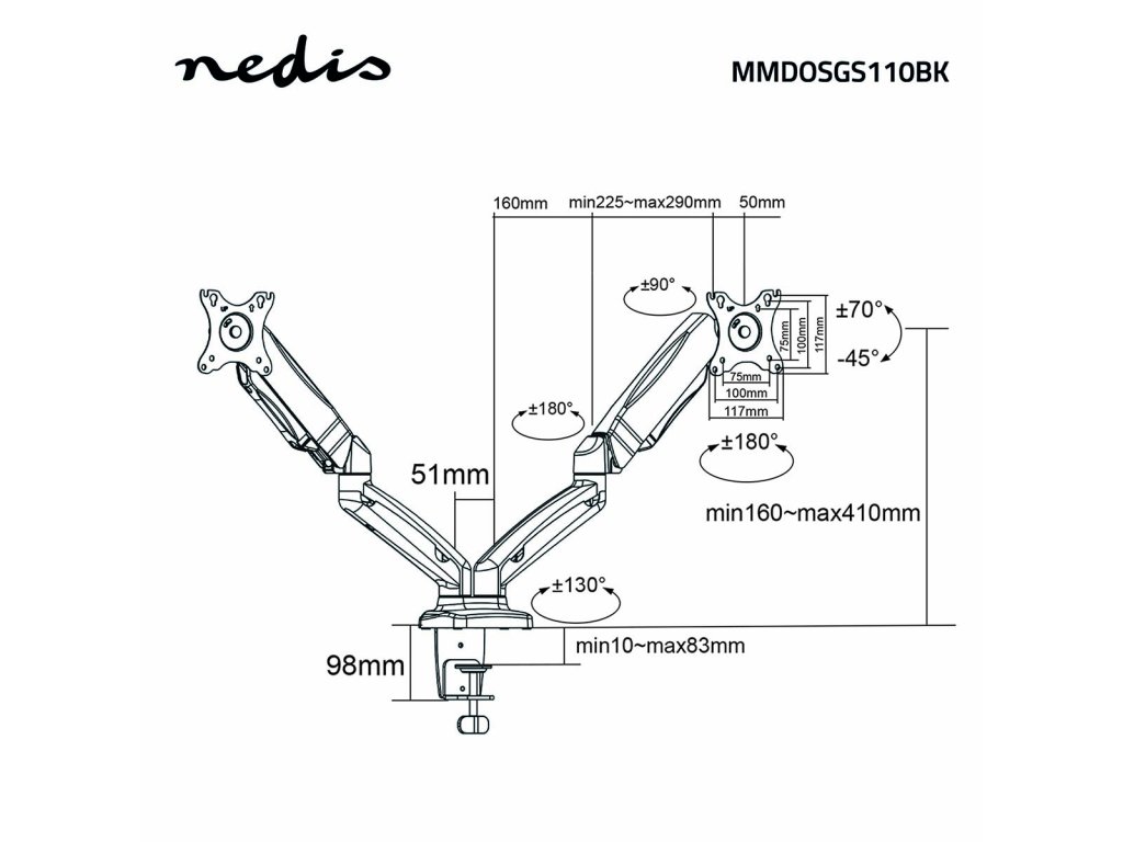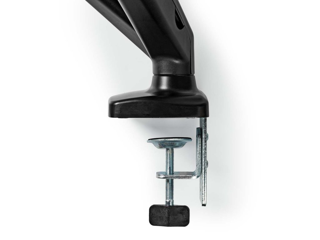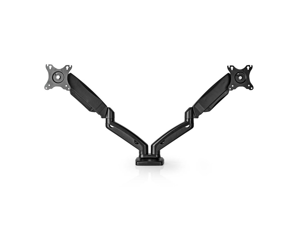 Tento držák Nedis je vhodný pro dvě ploché obrazovky s úhlopříčkou až 32". Všestranné možnosti naklápění (50°), otáčení (360°) a natočení (180°) umožňují nastavit držák do libovolného úhlu. Má vysoce kvalitní mechanismus plynové pružiny, který umožňuje bezproblémové vyrovnání pro vytvoření dokonalé pracovní polohy.