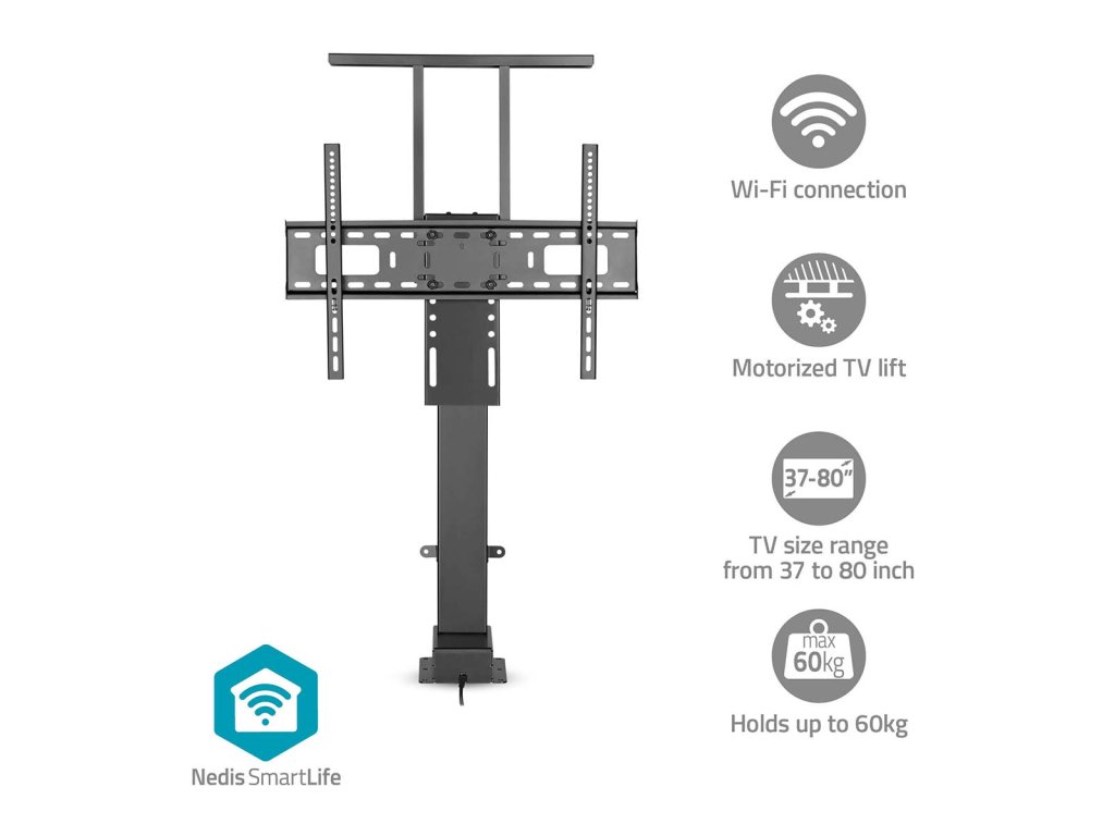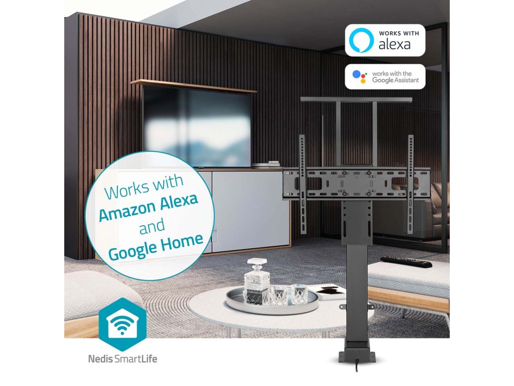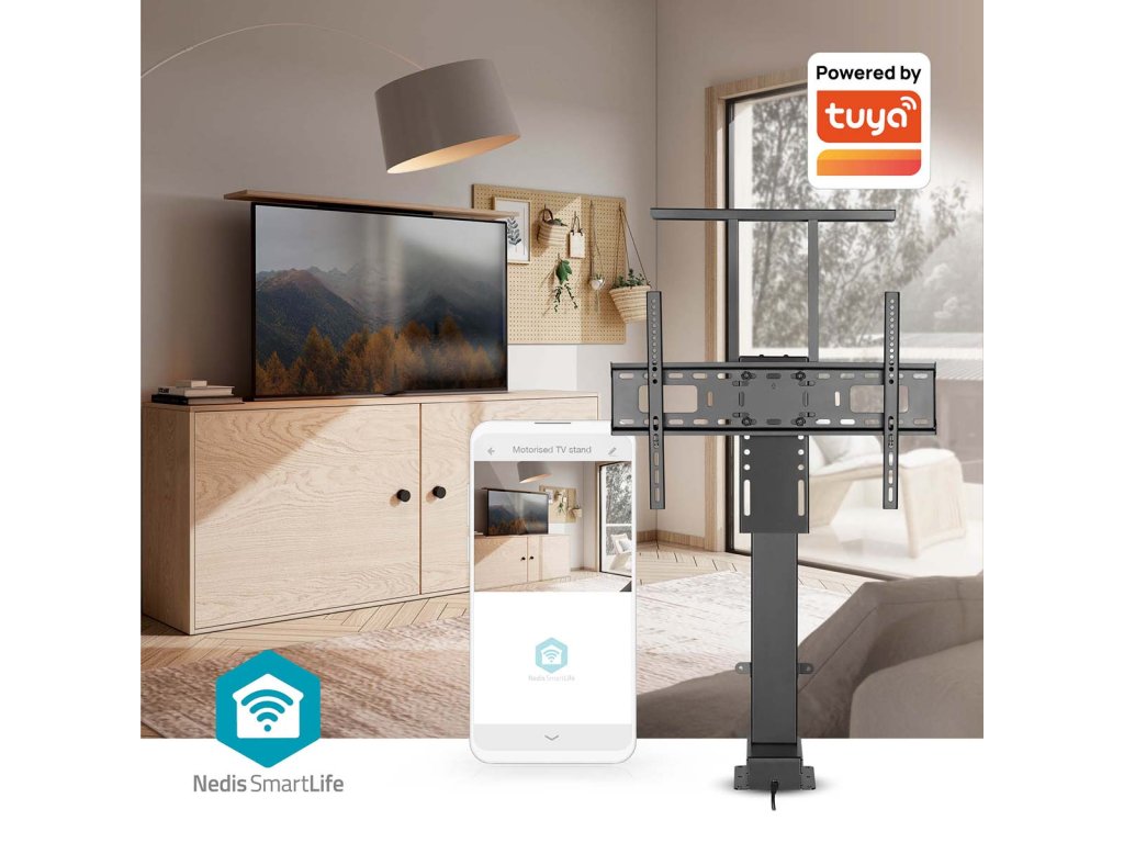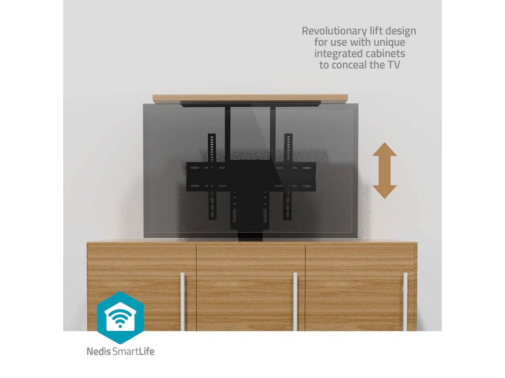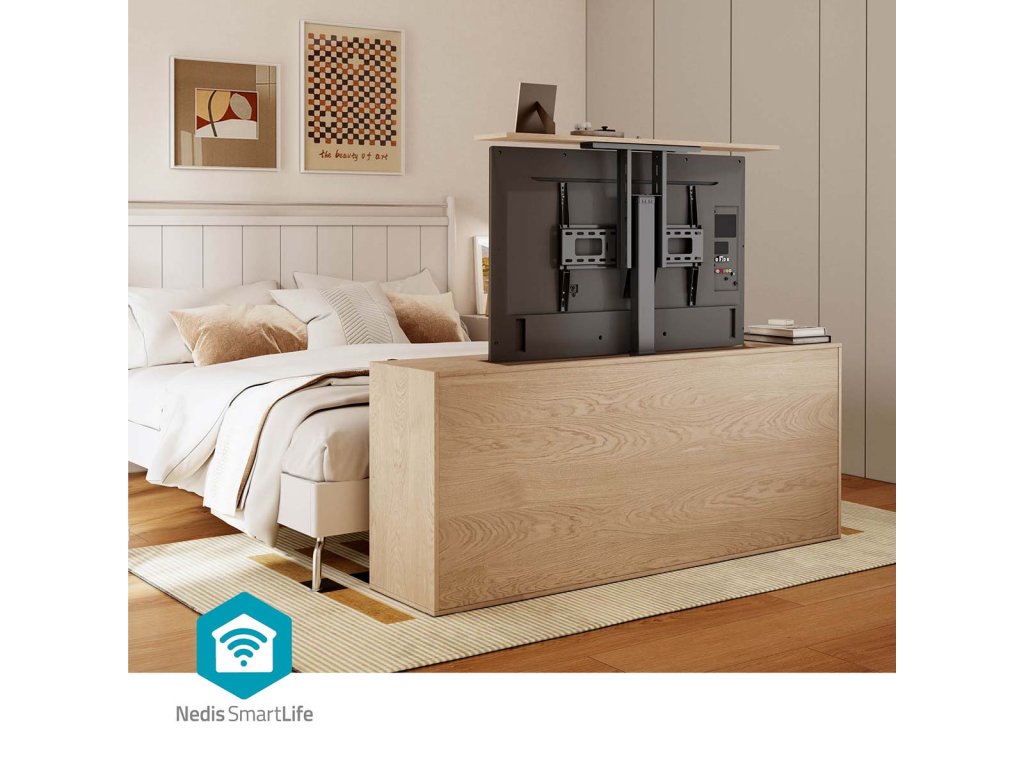 Nedis SmartLife Wi-Fi motorizovaný držák televizoru je navržen tak, aby ukryl televizory s plochou obrazovkou od 37" do 80" ve skříních. Horní panel skříně lze namontovat na stojan. To šetří místo a pomáhá zachovat minimalistický vzhled.