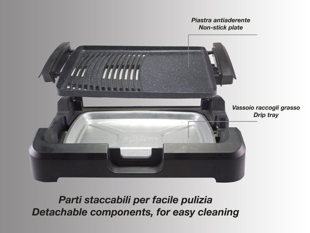 - Vyjímatelná půlená grilovací deska z litého hliníku o rozměru 39 × 29 cm