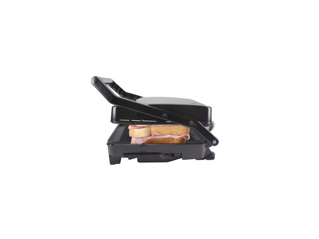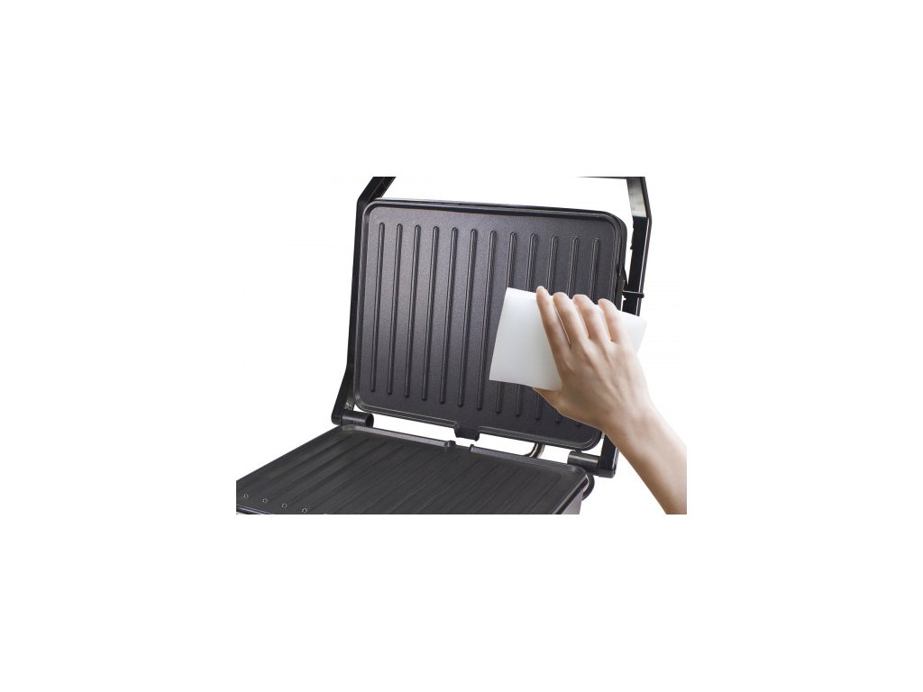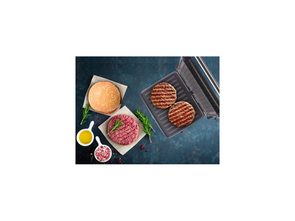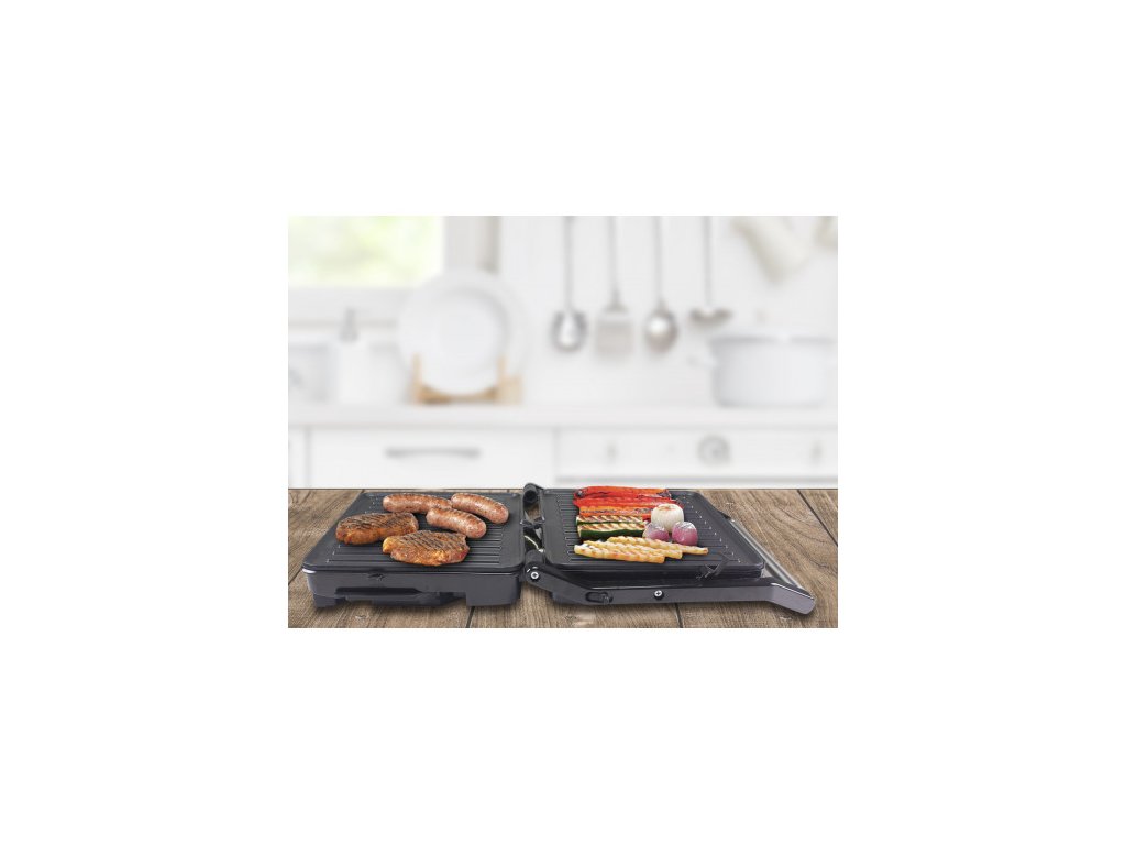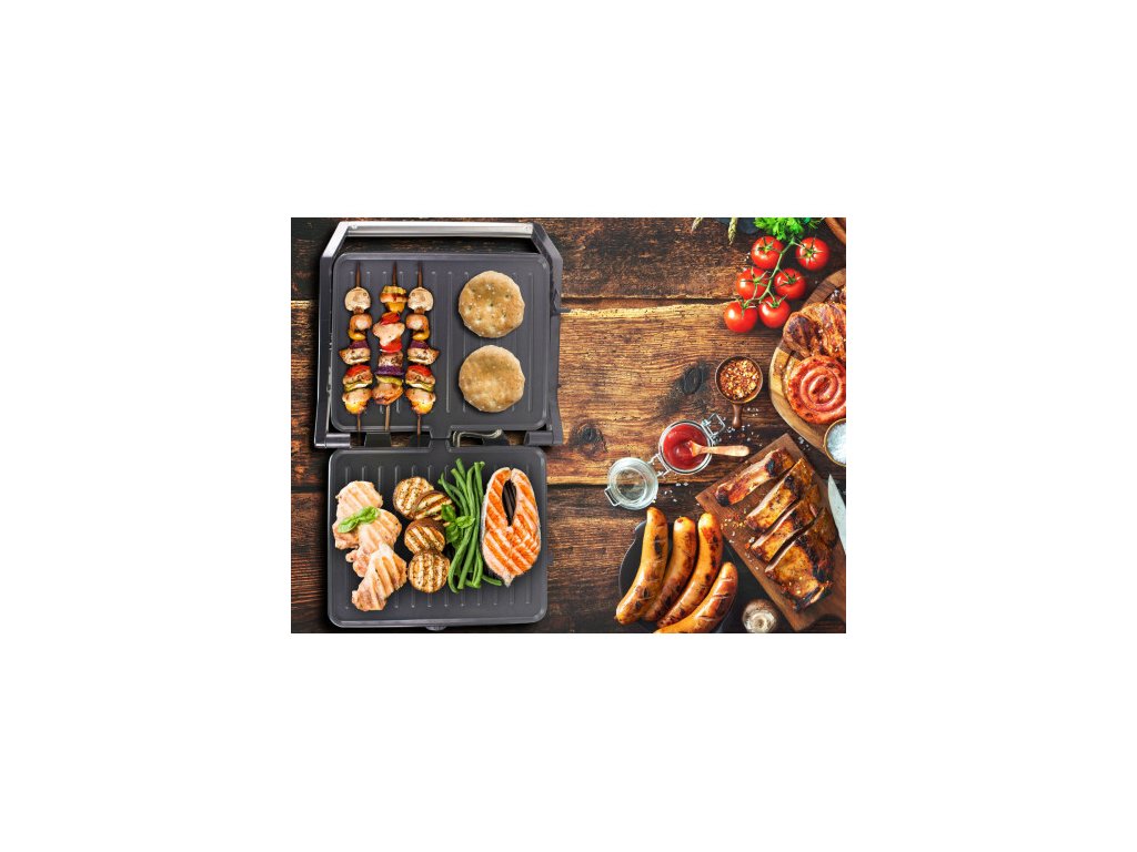 Multifunkční gril s ocelovou a bakelitovou strukturou a grilovacími deskami 29 x 24 cm z litého hliníku s nepřilnavým povrchem, přizpůsobitelný tloušťce jídla.