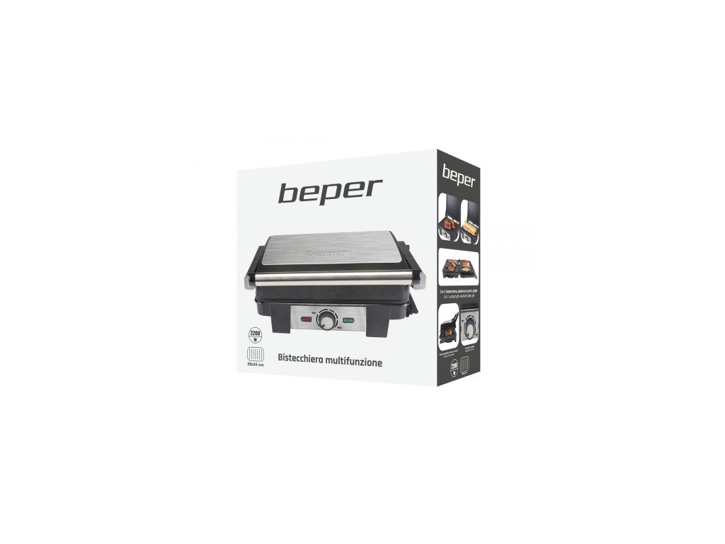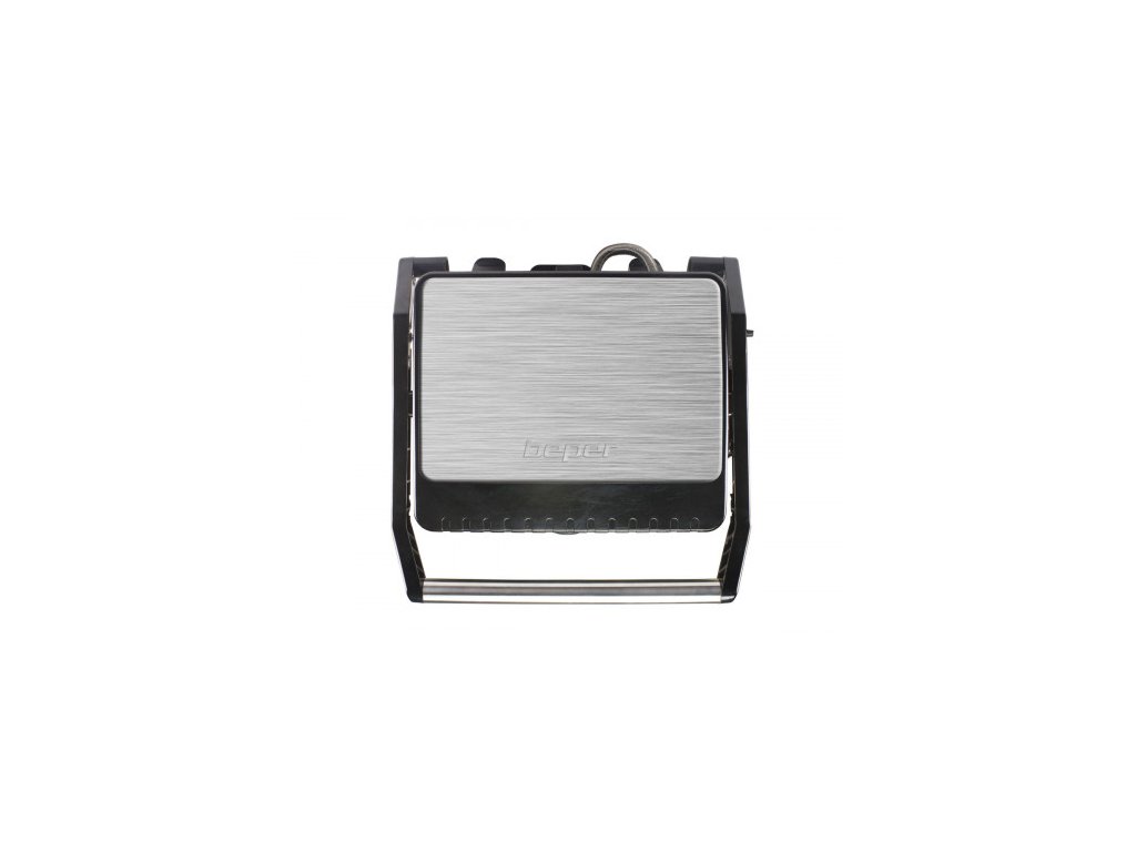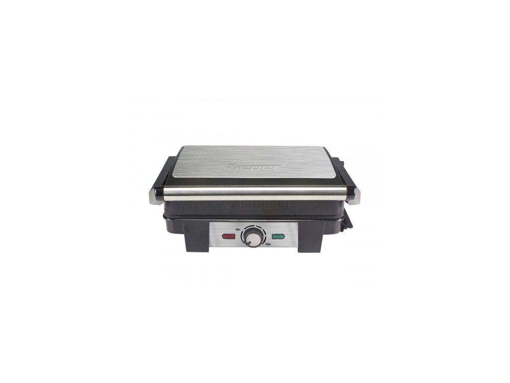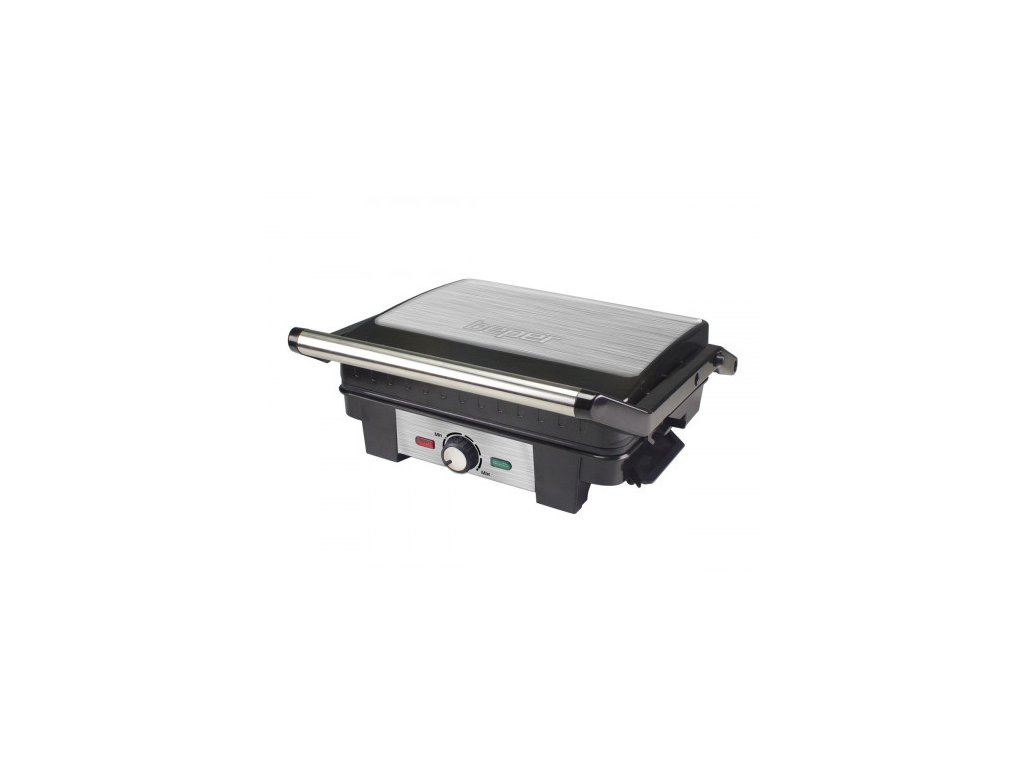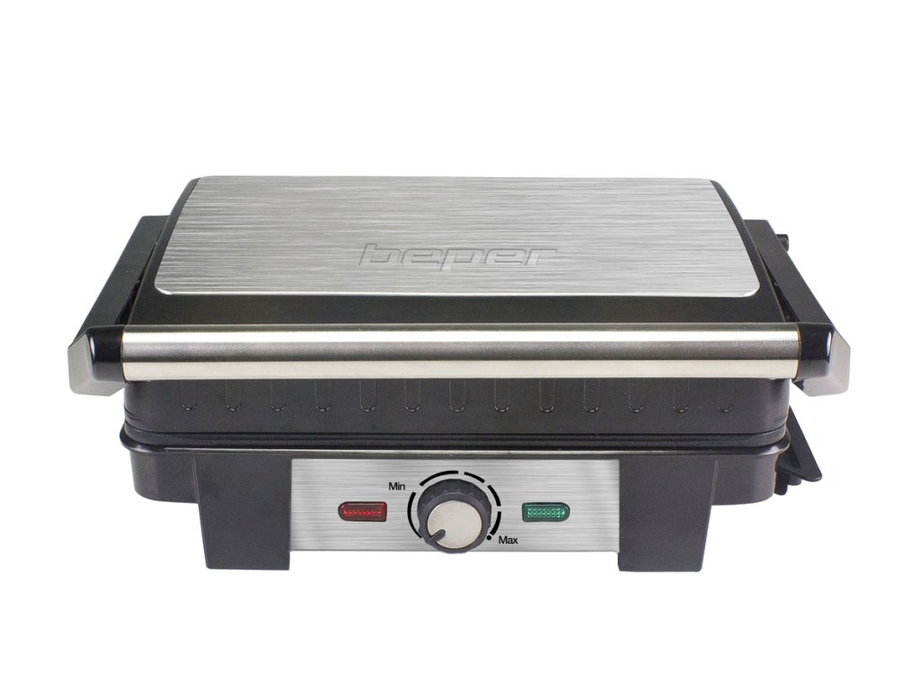 Multifunkční gril s ocelovou a bakelitovou strukturou a grilovacími deskami 29 x 24 cm z litého hliníku s nepřilnavým povrchem, přizpůsobitelný tloušťce jídla.