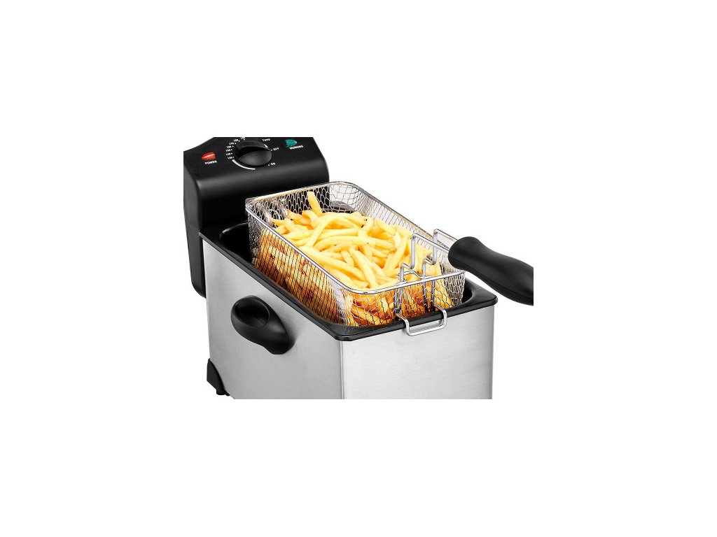 Výkonný motor 2 000W zajišťuje rychlé předehřátí a rychlou regulaci teploty oleje, s košem podlouhlého tvaru je ideální pro smažení velkých kusů kuřete nebo ryb. Nastavte různé teploty smažení pomocí nastavitelného termostatu, světelná indikace oznamuje, kdy je olej připraven ke smažení, a praktický kryt slouží jako štít proti rozstřiku při vkládání potravin do horkého oleje.