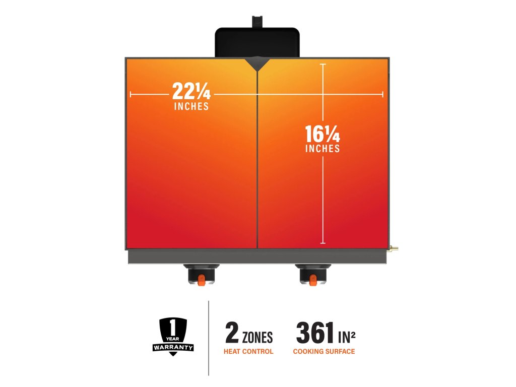 - Technologie grilovací desky: Rychlejší předehřátí a zotavení, rovnoměrné rozložení tepla, vyšší účinnost paliva s menším počtem jednotek BTU potřebných pro optimální teplotu vaření a vestavěná ochrana proti větru udržuje horký vzduch uvnitř a chladný venku.