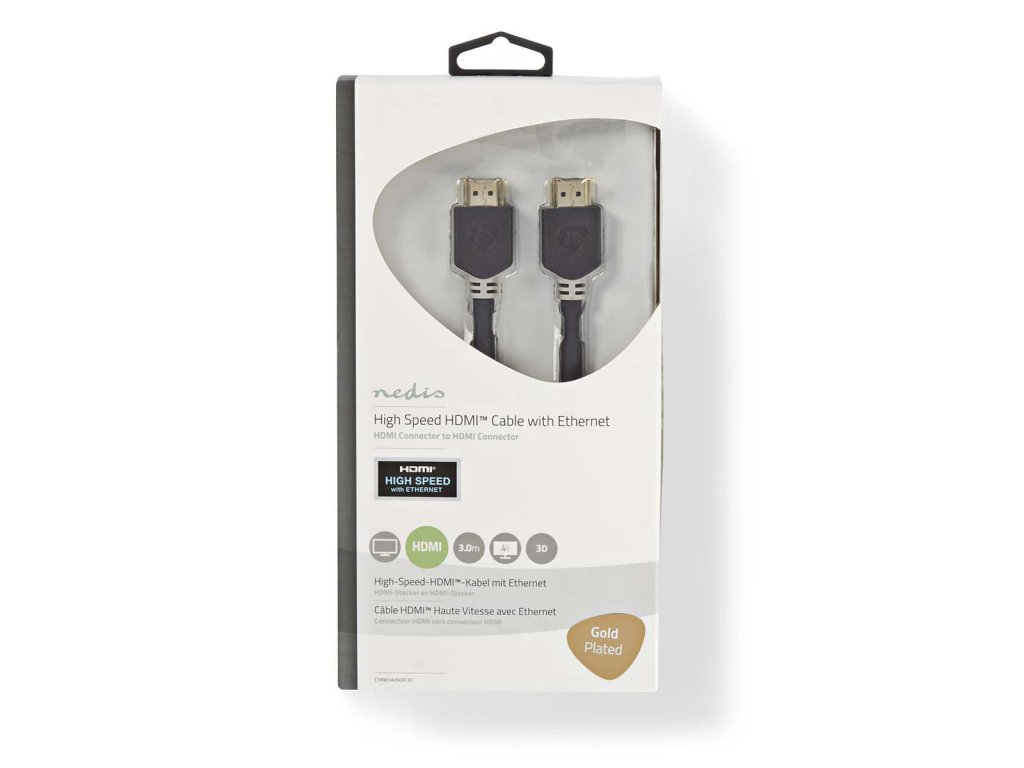 Značkový Nedis® High Speed HDMI propojovací kabel se zlacenými kontakty. HDMI Verze 1.4. Podporuje max. rozlišení videa 3840 x 2160, včetně pokročilých zobrazovacích technologií, jako jsou 3D a Deep Color. Délka 3 m.