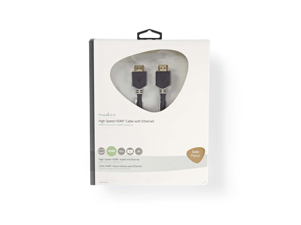Značkový Nedis® High Speed HDMI propojovací kabel se zlacenými kontakty. HDMI Verze 1.4. Podporuje max. rozlišení videa 3840 x 2160, včetně pokročilých zobrazovacích technologií, jako jsou 3D a Deep Color. Délka 7.5 m.