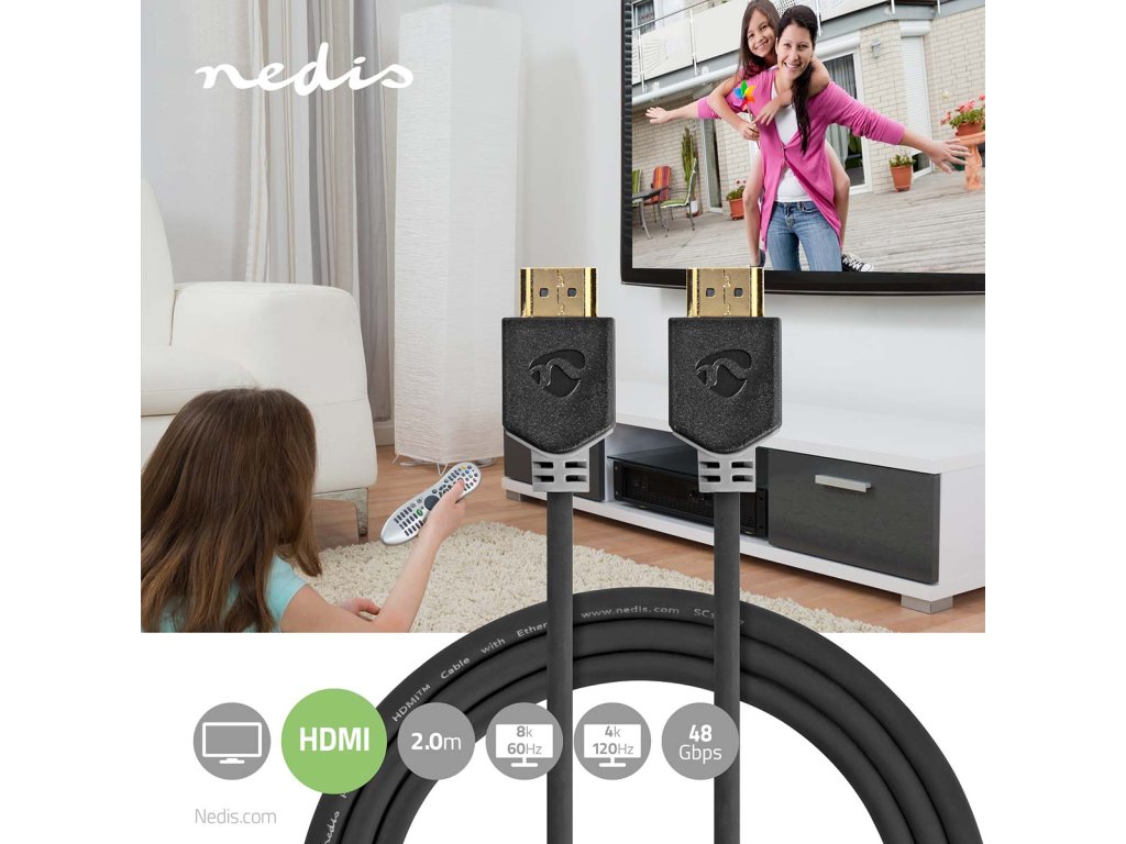 Nedis® značkový vysokorychlostní propojovací kabel Ultra HD HDMI™ ve verzi 2.1 se zlacenými kontakty. Podporuje max. datový přenos až 48 GB/s, rozlišení obrazu 8K s obnovovací frekvencí 60 Hz a 4K s frekvencí 120 Hz. Vysoká datová propustnost zaručuje bezproblémový přenos nekomprimovaného rozlišení videa 8K ve formátu HDR. Kabel má mimořádně nízké elektromagnetické rušení (EMI), které snižuje rušení okolních bezdrátových zařízení a je zpětně kompatibilní se všemi staršími formáty HDMI a lze jej spolehlivě použít se stávajícími nainstalovanými zařízeními HDMI. Balení v krabičce.