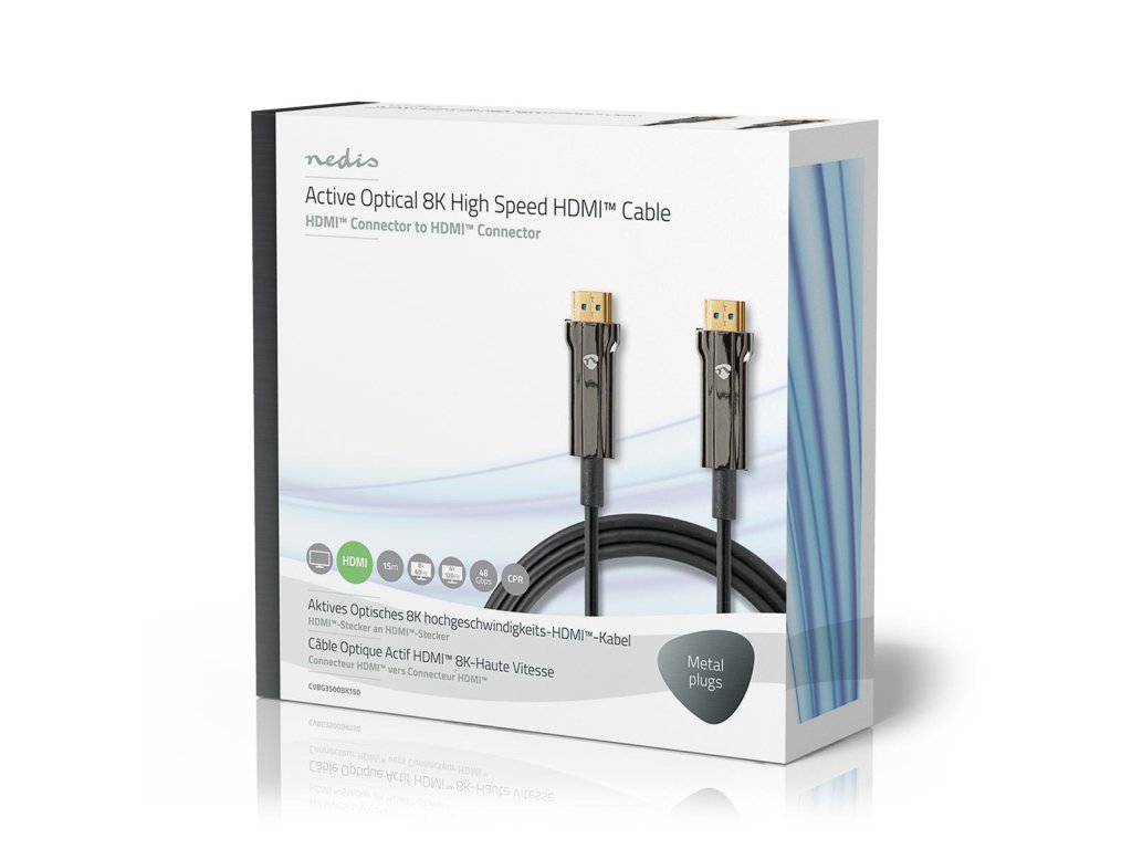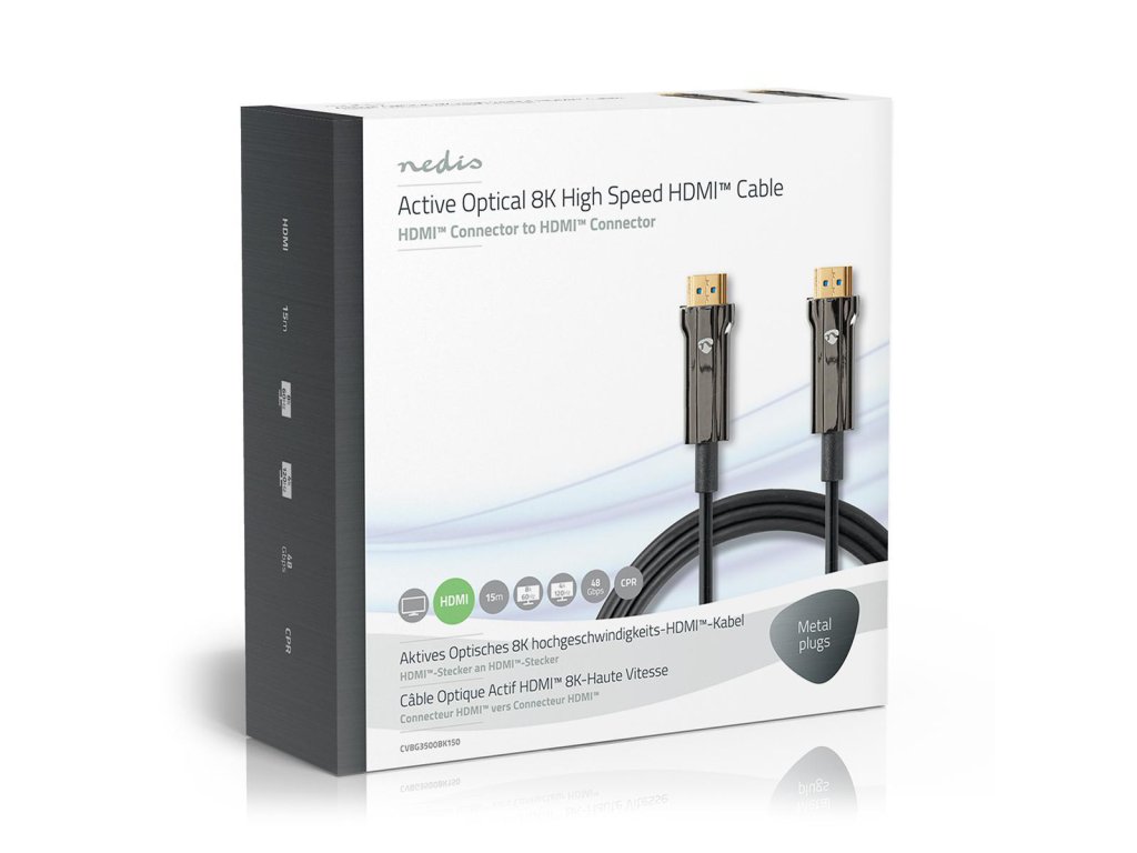 Ultra HDMI aktivní optický kabel (AOC) Nedis® CVBG3500BK150 délky 15 m je dokonalým řešením pro přenos objemných a vysoce kvalitních dat na dlouhé vzdálenosti téměř bez žádné ztráty. Díky celokovovému pouzdru konektoru je kabel vysoce odolný vůči elektromagnetickému (EMI) a radiofrekvenčnímu (RFI) rušení. Společně s CPR certifikací je kabel ideální k použití do budov a kanceláři, které představují pevnou překážku mezi zdrojem a displejem.