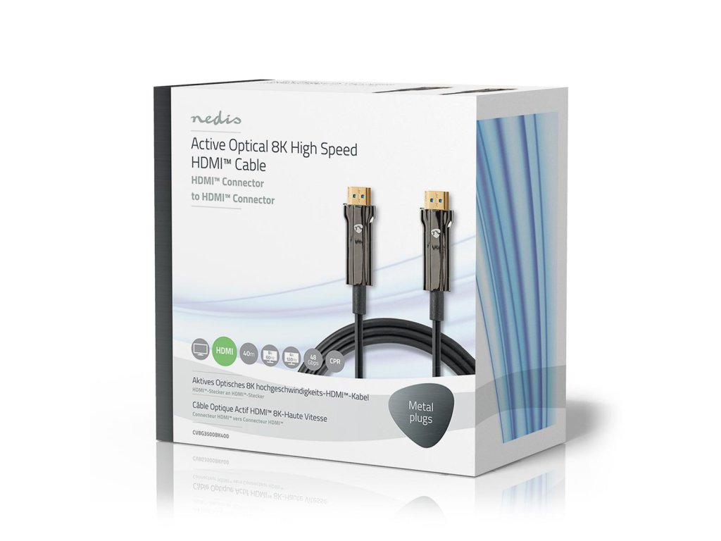 Ultra HDMI aktivní optický kabel (AOC) Nedis® CVBG3500BK400 délky 40 m je dokonalým řešením pro přenos objemných a vysoce kvalitních dat na dlouhé vzdálenosti téměř bez žádné ztráty. Díky celokovovému pouzdru konektoru je kabel vysoce odolný vůči elektromagnetickému (EMI) a radiofrekvenčnímu (RFI) rušení. Společně s CPR certifikací je kabel ideální k použití do budov a kanceláři, které představují pevnou překážku mezi zdrojem a displejem.