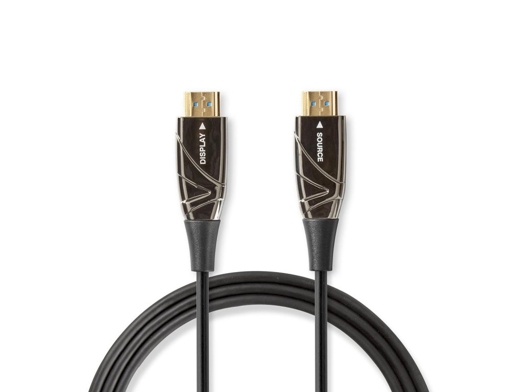 HDMI aktivní optický kabel (AOC) Nedis® CVBG3400BK1000 délky 100 m je dokonalým řešením pro přenos objemných a vysoce kvalitních dat na dlouhé vzdálenosti téměř bez žádné ztráty. Díky celokovovému pouzdru konektoru je kabel vysoce odolný vůči elektromagnetickému (EMI) a radiofrekvenčnímu (RFI) rušení. Společně s CPR certifikací je kabel ideální k použití do budov a kanceláři, které představují pevnou překážku mezi zdrojem a displejem.