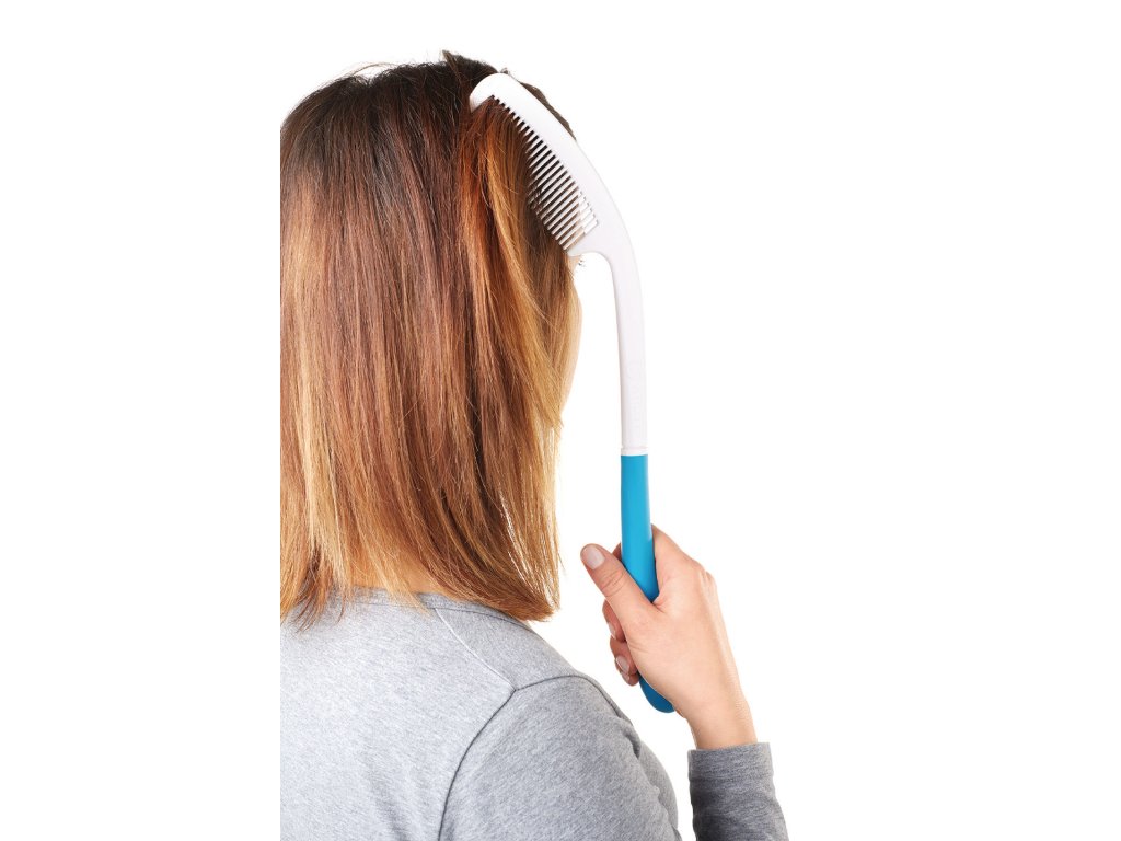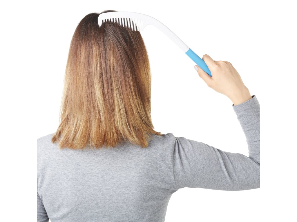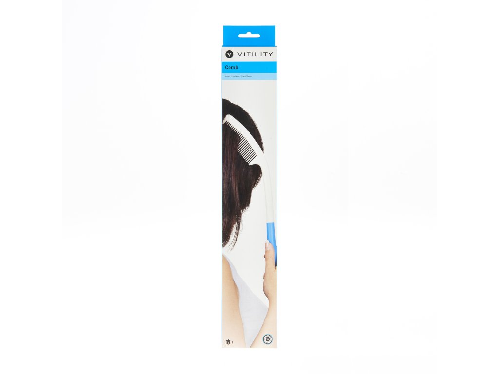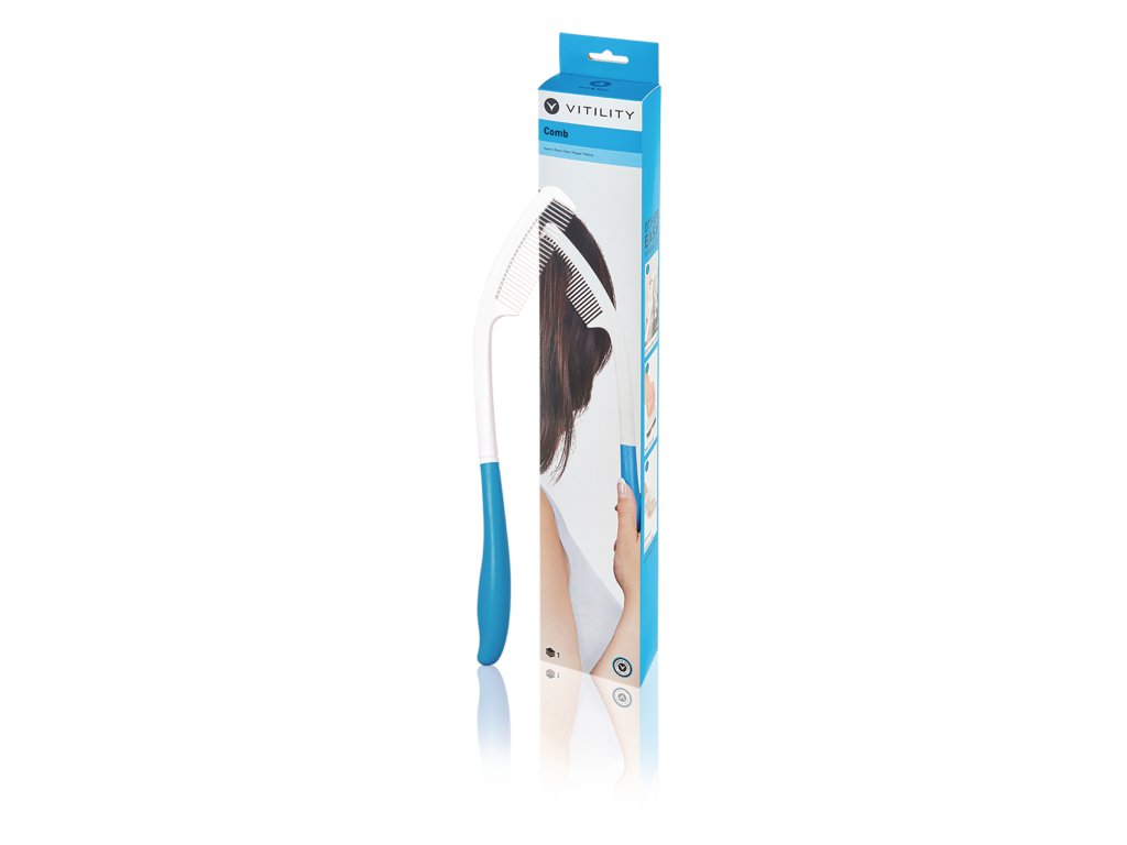 Ergonomicky tvarovaný hřeben Vitility s prodlouženou rukojetí. S hřebenem Vitility se snadno dostanete k zadní a horní části hlavy bez zbytečného namáhání rukou, paží nebo ramen. Protiskluzová rukojeť pro pevné a spolehlivé uchopení.