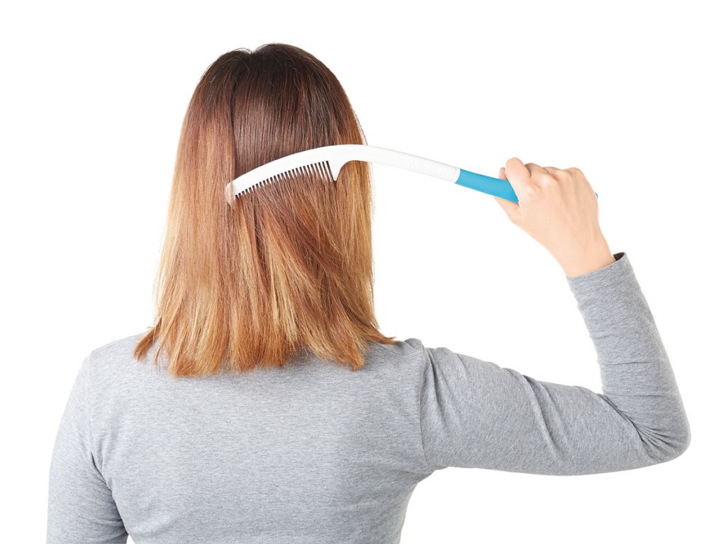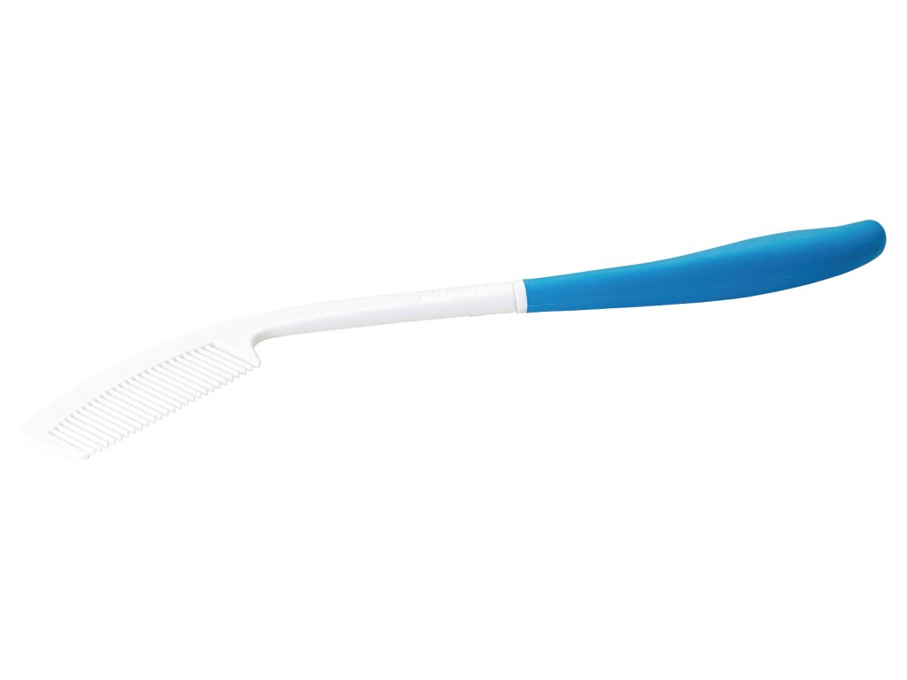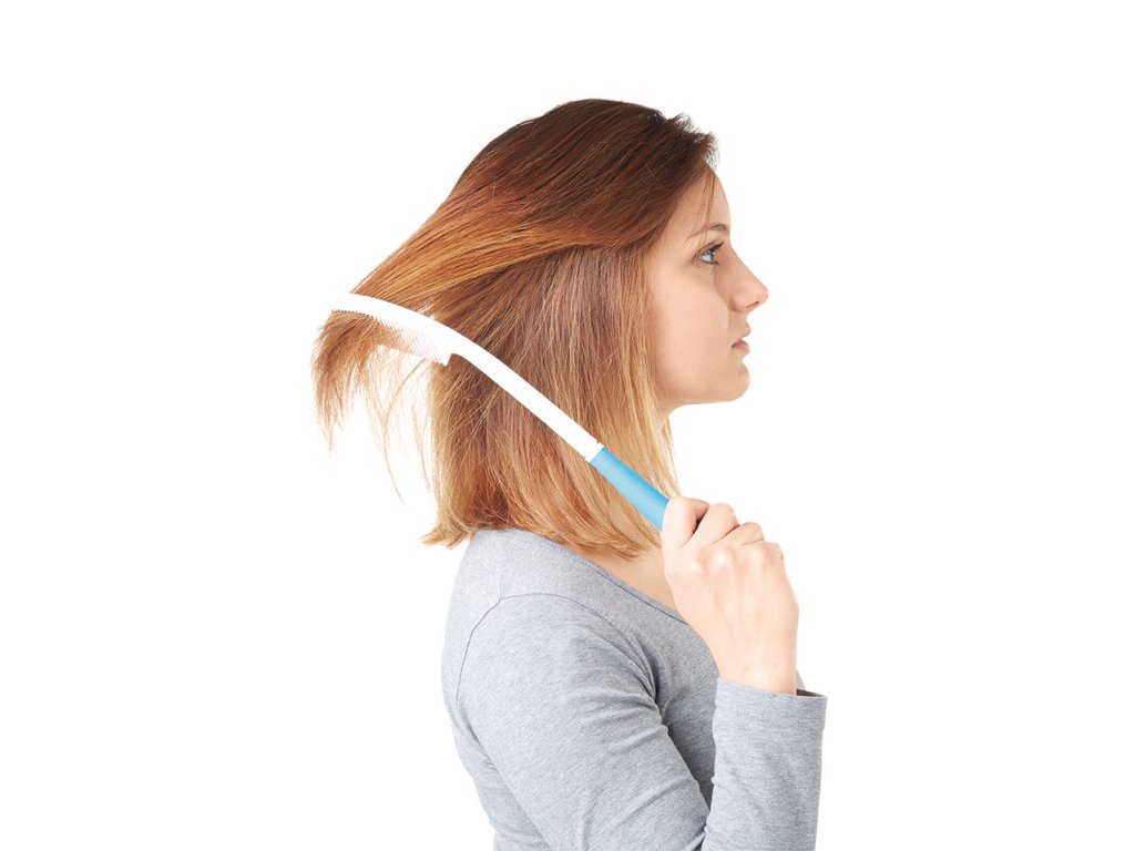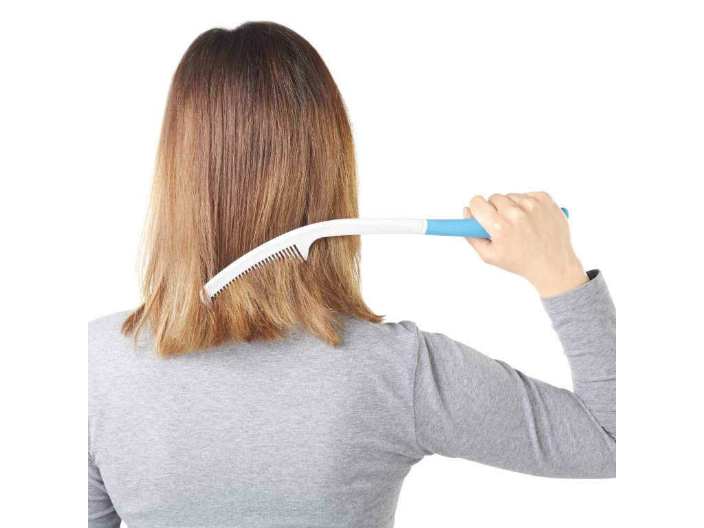Ergonomicky tvarovaný hřeben Vitility s prodlouženou rukojetí. S hřebenem Vitility se snadno dostanete k zadní a horní části hlavy bez zbytečného namáhání rukou, paží nebo ramen. Protiskluzová rukojeť pro pevné a spolehlivé uchopení.