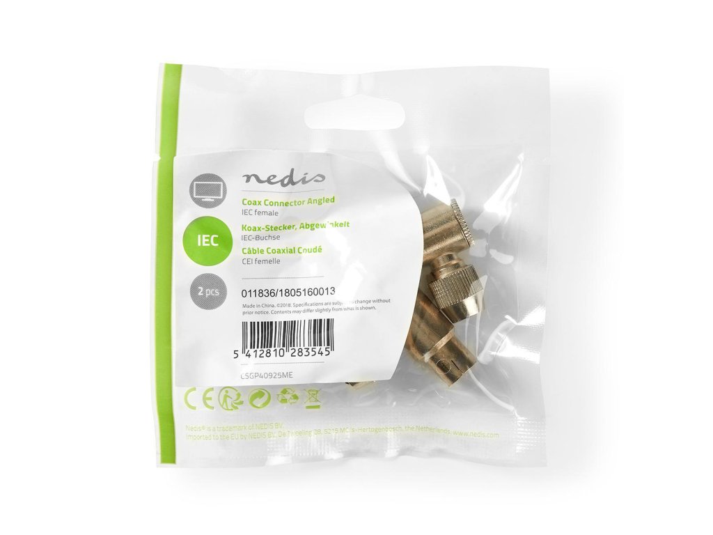 Anténní celokovový IEC konektor v provedení úhlová TV zásuvka (samice). Vhodný pro montáž na koaxiální kabel. Balení 2 ks, cena za celé balení.
