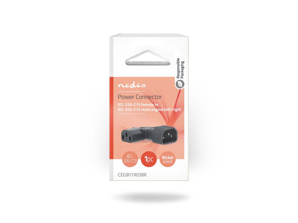 Úhlová napájecí redukce z IEC-320-C14 na IEC-320-C13 v pravém úhlu. S touto redukcí můžete napájecí kabel připojit k zařízením, která mají méně prostoru pro konektory na zadní straně.