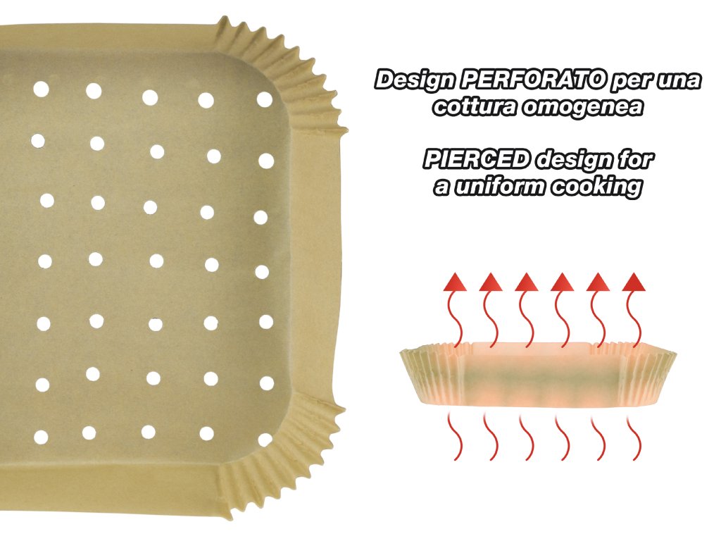 - Perforované dno umožňující snadnou cirkulaci vzduchu pro rovnoměrnou přípravu pokrmů