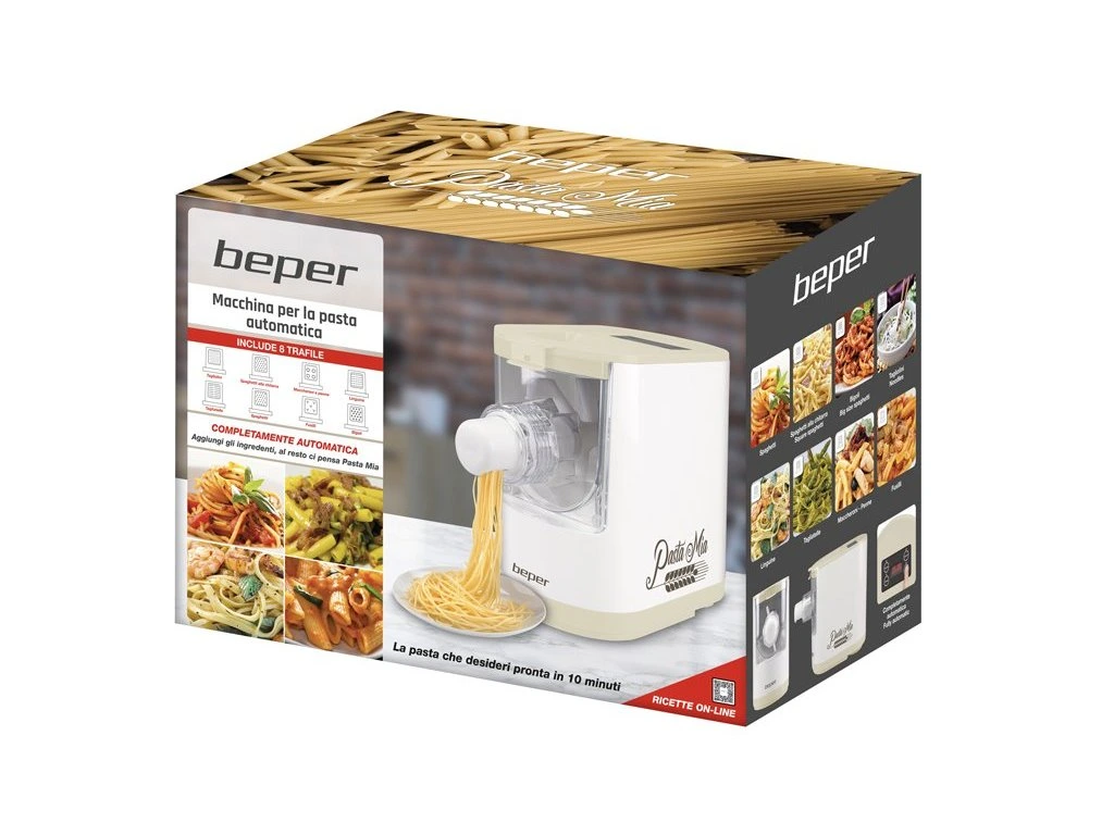 Těstoviny, všichni je milujeme a také všichni víme, že doma vyrobené jsou mnohem lahodnější, ale obvykle také pracnější. Proto vám přinášíme tento automatický stroj na těstoviny, s nímž čerstvé a chutné domácí těstoviny nebyly nikdy jednodušší. Můžete mít čerstvé špagety, penne nebo fusilli již za 10 minut, protože BEPER P102SBA500 automatický stroj na těstoviny hněte a připraví požadovaný tvar těstovin v době varu vody. Všechnu těžkou práci udělá za vás, stačí přidat ingredience a vybrat si, jaký druh těstovin chcete, přidejte výživné ingredience jako vejce, špenát a vytvořte chutné domácí těstoviny pro vaši rodinu, pro vaše přátele. Je to nejjednodušší způsob výroby čerstvých zdravých těstovin včetně bezlepkového typu.