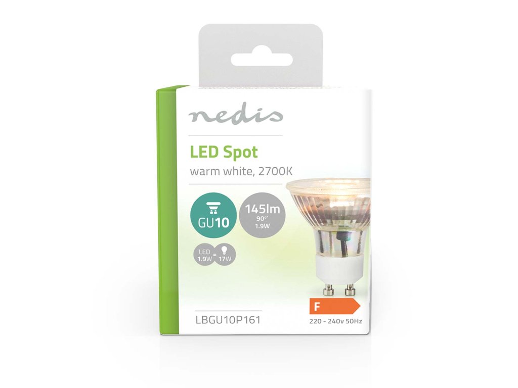 Nedis® LED žárovka ve tvaru PAR16 s paticí GU10, světelným tokem 140 lm a a velice nízkou spotřebou energie 1.9 W. Vyzařuje teplé bílé světlo o barevné teplotě 2700 K.