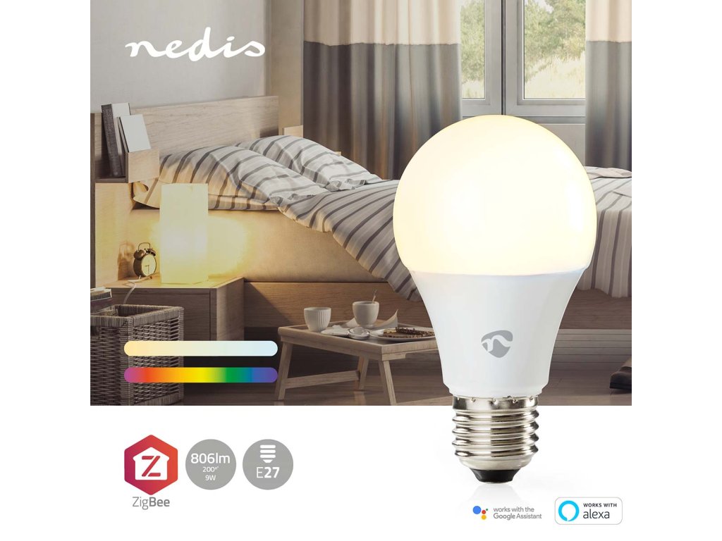Nedis® SmartLife™ Zigbee 3.0 LED žárovka. Převezměte kontrolu nad svými světly pomocí této chytré žárovky, která se připojuje přímo k bráně Nedis Zigbee a poskytuje tak v rámci Vašeho automatického domácího systému dálkové ovládání. Pomocí aplikace Nedis SmartLife můžete ovládat barvu a jas žárovky nebo můžete žárovku propojit s asistentem Google Home nebo Amazon Alexa a ovládat ji hlasem. Pro větší pohodlí můžete také použít dálkový ovladač Zigbee a chytrou žárovku snadno zapnout či vypnout nebo upravit její jas.