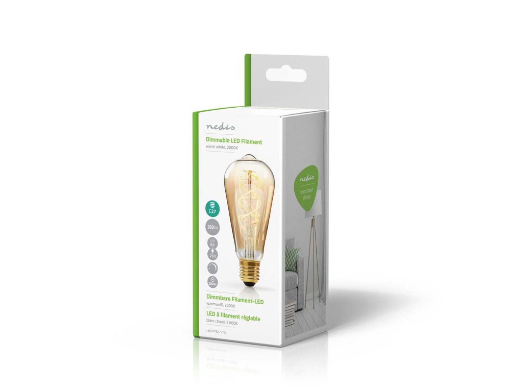 Nedis® retro LED vláknová žárovka v provedení ST64 s paticí E27, světelným tokem 260 lm a velice nízkou spotřebou energie 5 W. Elegantní žárovka s kroucenými LED vlákny má jantarové zabarvení skla a svítí teplým bílým světlem o barevné teplotě 2000 K.