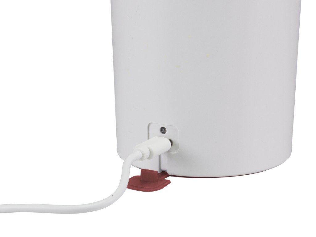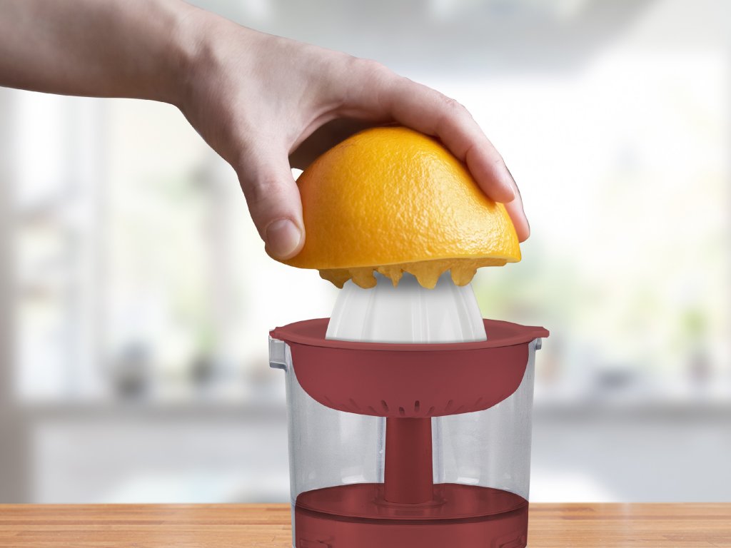 - Praktický nabíjecí lis na citrusy v elegantním bílo-červeném provedení