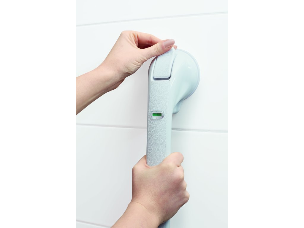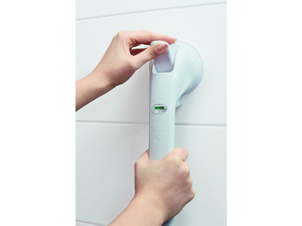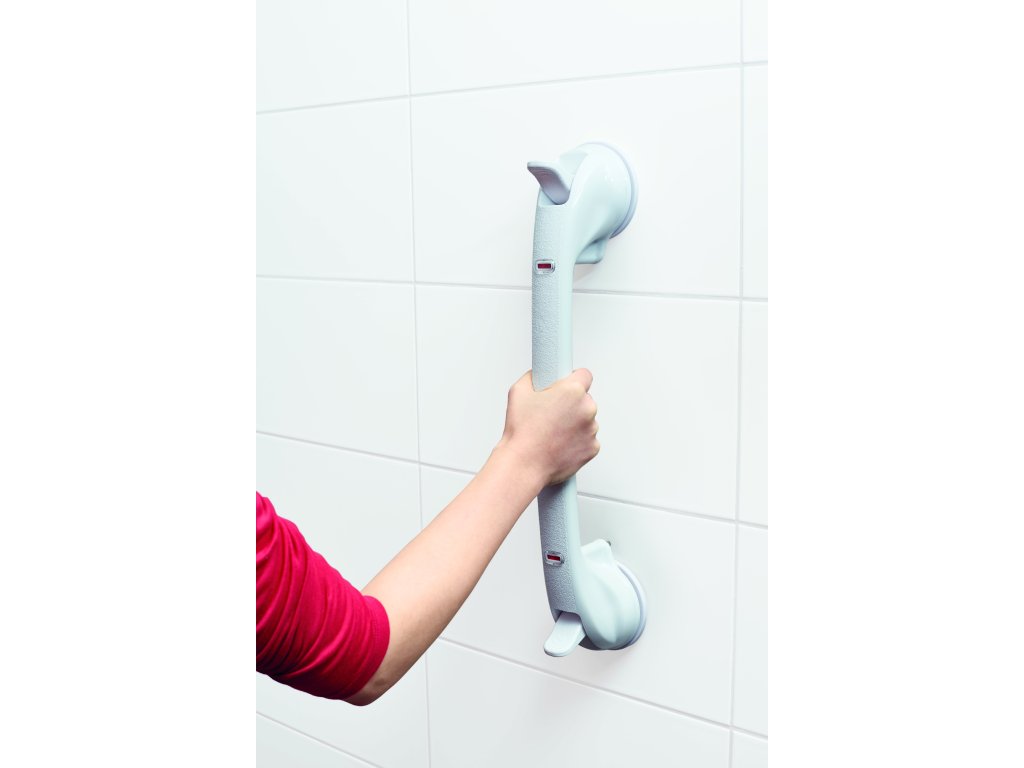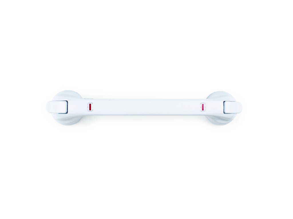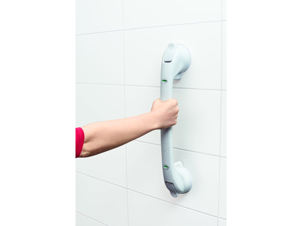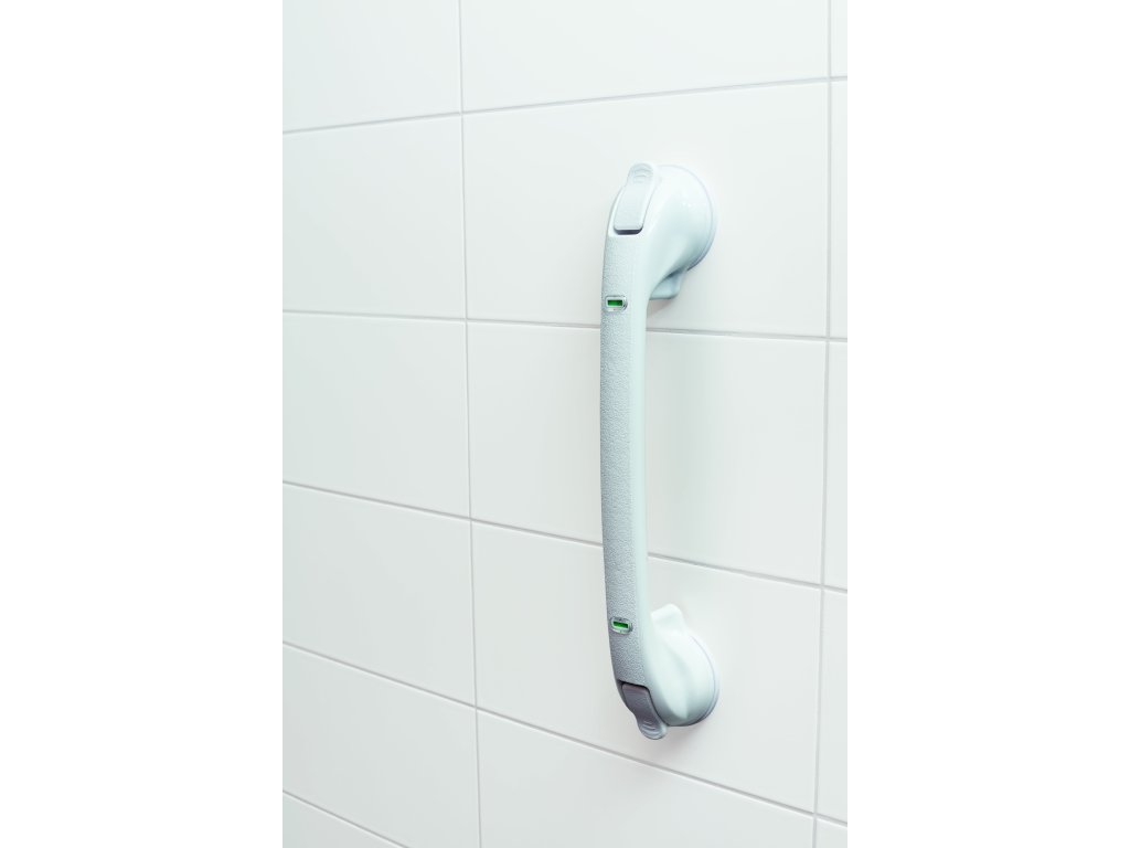 Kvalitní a spolehlivé 50 cm mobilní madlo VIT-70110520. Madlo bylo navrženo tak, aby poskytlo podporu v přirozeném pohybu, například při vcházení a vycházení ze sprchy nebo vany. Na madlo nelze přenést celou váhu těla, je navrženo pro zatížení max. 60 kg. Lze jej připevnit nebo odstranit během několika vteřin. Pro upevnění není nutné žádné vrtání otvorů nebo šroubování, dvě silné přísavky se pevně přitisknou na neporézní, pevný povrch a vakuové úchyty zatlačením dolů madlo dokonale a bezpečně upevní. Vestavěná vizuální indikace u přísavek signalizuje správné upevnění. Vyrobeno z odolného plastu.