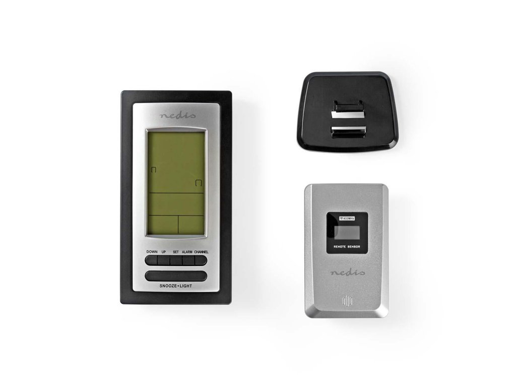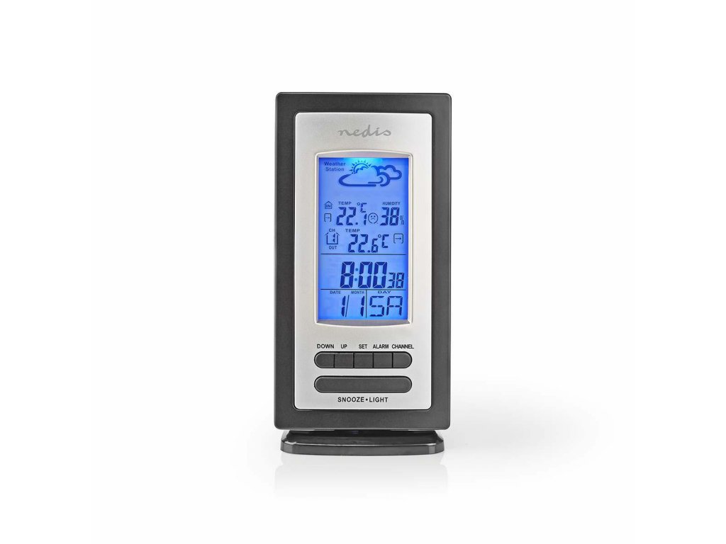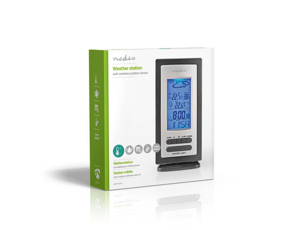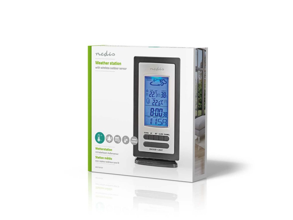 Bezdrátová meteostanice Nedis® WEST201GY zobrazuje přesné a detailní informace o měření vnitřní i vnější teploty a relativní vlhkosti vzduchu v interiéru. Zobrazuje předpověď počasí prostřednictvím 4 piktogramů pro slunečno, polojasno, oblačno a déšť, dále hodiny, datum a budík s funkcí odloženého buzení "snooze".