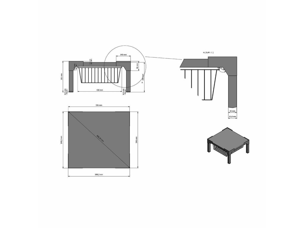Základna s rozměry 600 x 550 mm, výška 290 mm. Max. nosnost 250 kg. Vzdálenost od podlahy ke spodní hraně šuplíku je 45 mm.