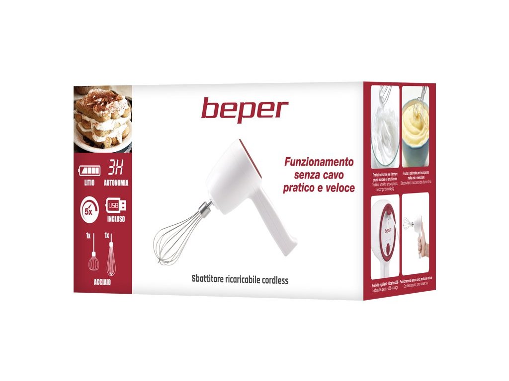 Praktický akumulátorový mixér Beper P102SBA007 k rychlému mixování, šlehání a šlehání různých potravin. Tento ruční mixér vás svými malými rozměry a nízkou hmotností prostě dostane, je příjemný do ruky, lehký, přenosný, snadno se s ním při vaření manipuluje. A tu svobodu pohybu, kterou vám poskytne, budete milovat.